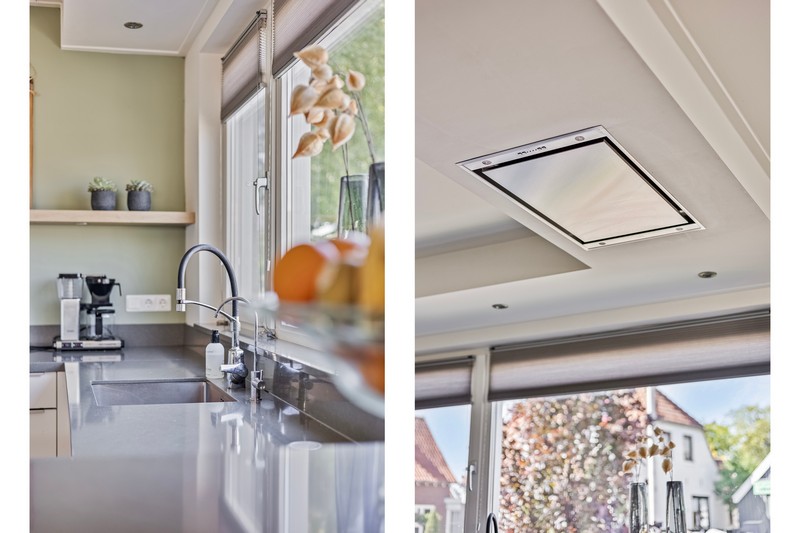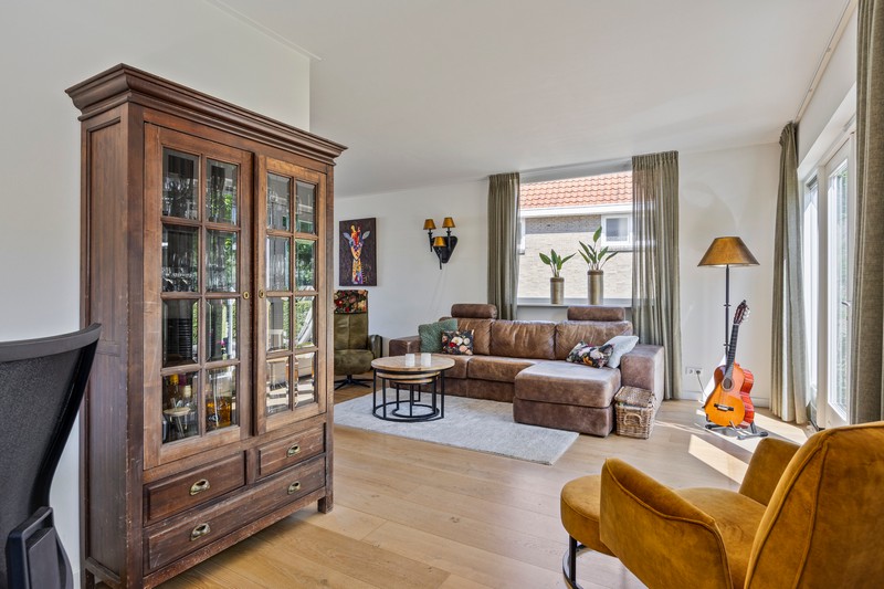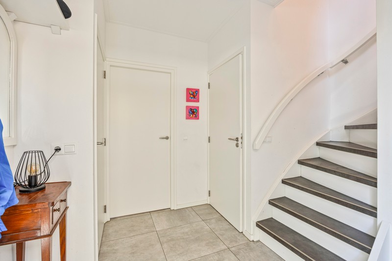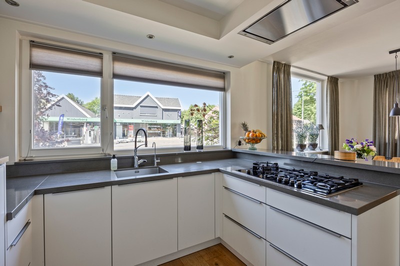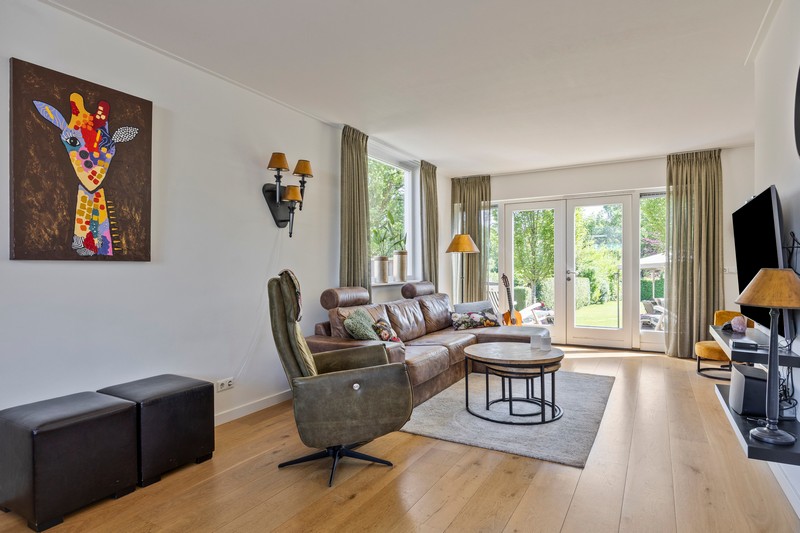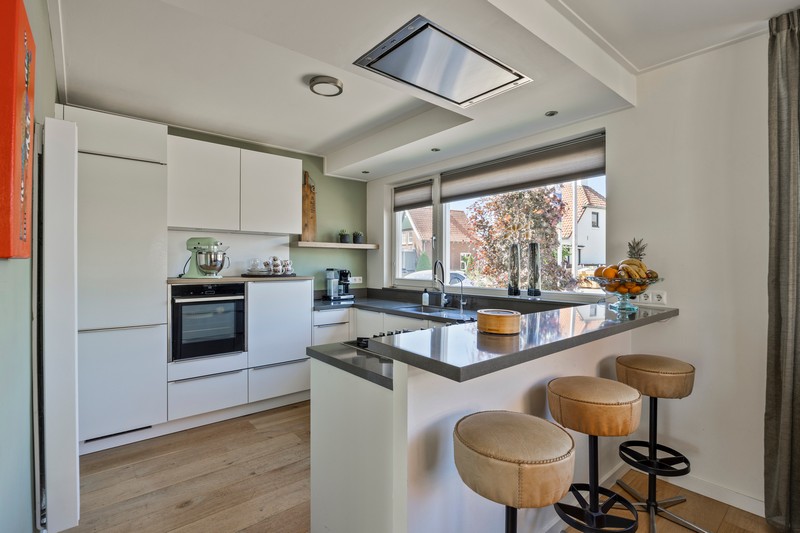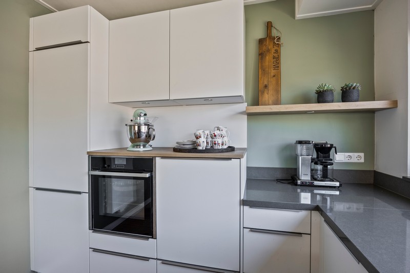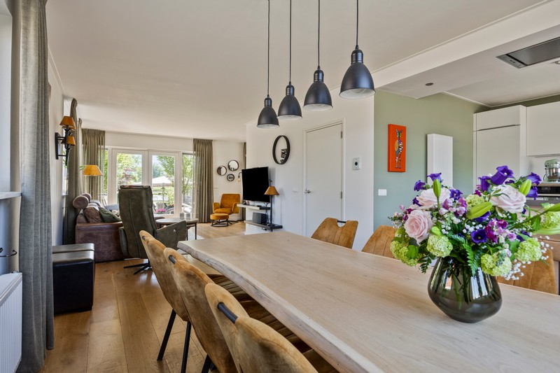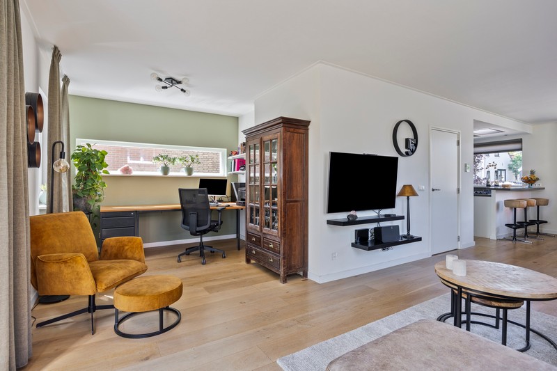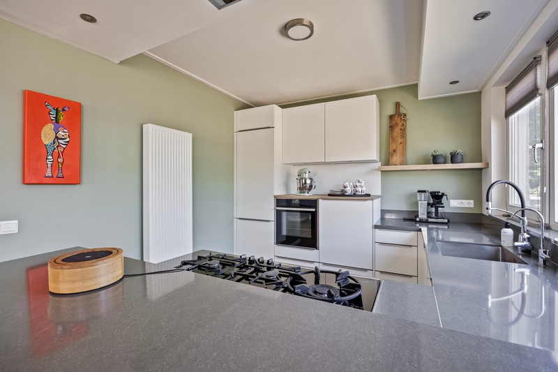 Eenmaal terug op de begane grond komen we vanuit de hal met toilet en meterkast in de ruime leefruimte. Aan de voorzijde vinden we een moderne inbouwkeuken met allerhande apparatuur waaronder een 5-pits gaskookplaat met wokbrander, geïntegreerde afzuiging, vaatwasser op hoogte, koel-/vriescombinatie en grootformaat oven. Eén ander afgewerkt met een composiet aanrechtblad. De L-vormige woonkamer bevindt zich aan de achterzijde. De dubbele tuindeuren geven toegang tot het terras en de diepe tuin. Om de hoek is een werkplek gesitueerd.