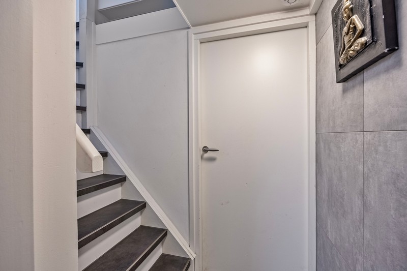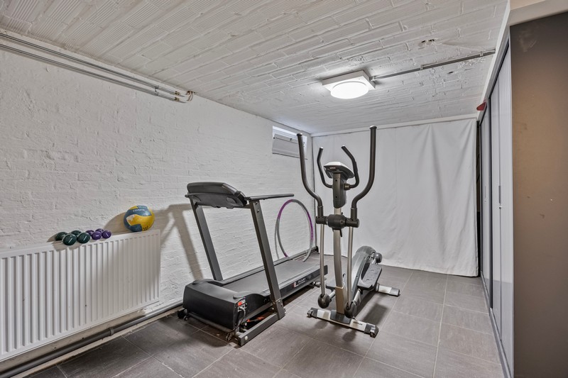 Vanuit de hal dalen we eerst af naar beneden! Onder de gehele woning bevindt zich een souterrain. Allereerst vinden we aan de rechterzijde een betegelde wasruimte. Aan de linkerzijde vinden we de fitnessruimte en vanuit deze ruimte komen we in de ruime werk-/hobbyruimte.