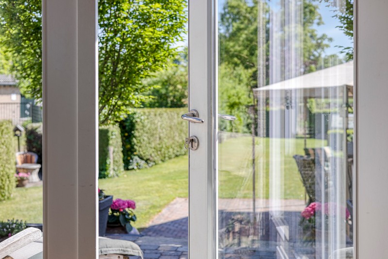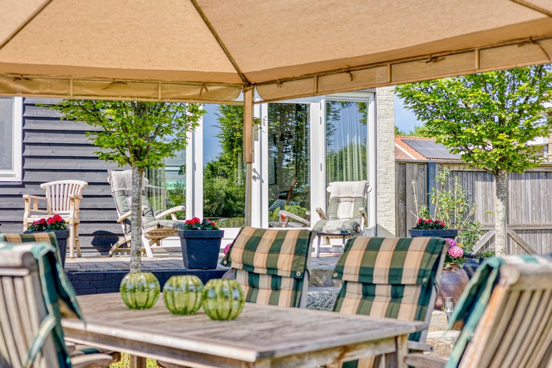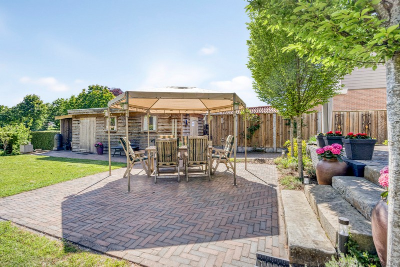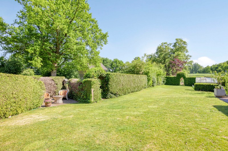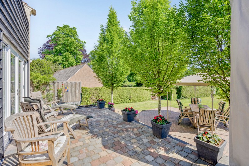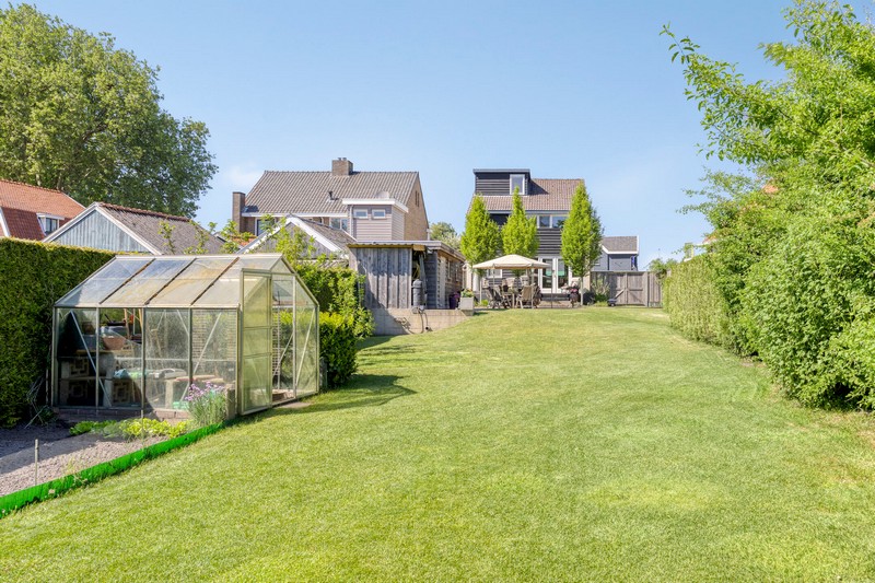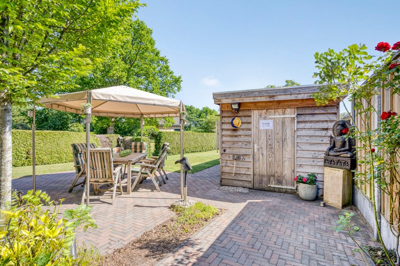 En dan de tuin! Wat een ruimte en wat een uitzicht. Achter de tuin zijn weilanden gelegen. Omdat de woning al wat hoger ligt kijk je ook vanuit de woning uit over de landerijen achter de woning. De diepe tuin geeft uiteraard enorm veel privacy. Ook de zonligging is goed. Er zijn altijd plekken van zon en schaduw te vinden. In de tuin vinden we ook nog een recent gebouwde praktijkruimte en een plantenkas. Parkeren kan aan de voorzijde van de woning waar minimaal 3 auto’s kunnen staan.