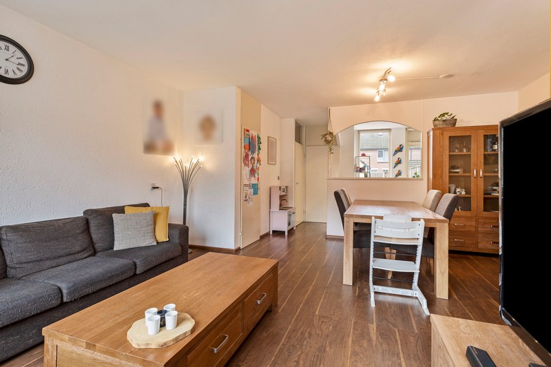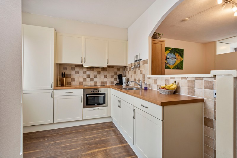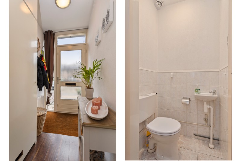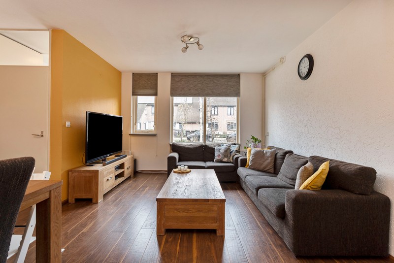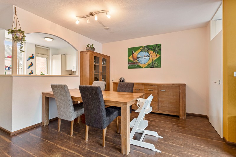 Via de hal met garderobenis en meterkast komen we in de Z-vormige woonkamer met zithoek aan de voorzijde en eethoek aan de keukenzijde. De keuken is afgescheiden middels een halfhoog muurtje waardoor licht ongehinderd toegang heet tot de gehele benedenverdieping. De inbouwkeuken is voorzien van een keramische kookplaat, afzuiging, koelkast, vriezer en combioven. Het portaal aan de achterzijde, met aan de rechterzijde de toiletruimte leidt ons naar de 1e verdieping.