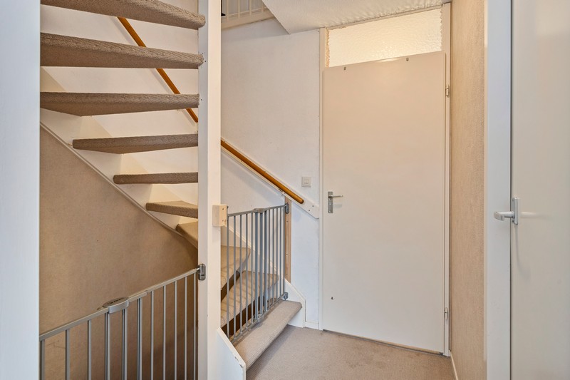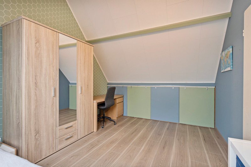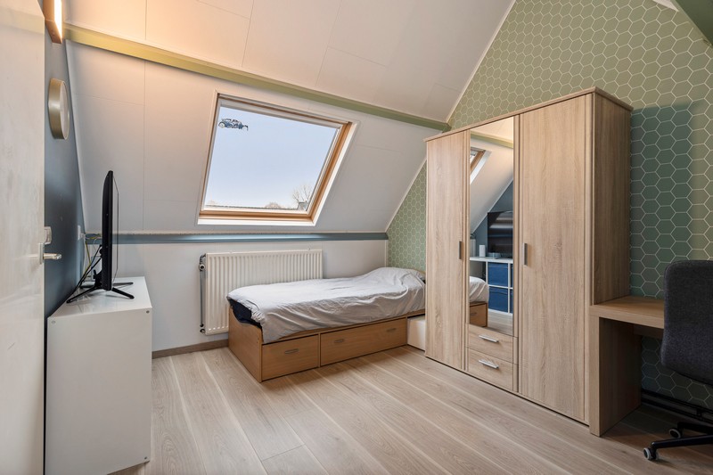 Op de middels een vaste trap bereikbare 2e verdieping vinden we naast de ruime slaapkamer de nodige bergruimte een ruime overloop met plek voor de wasmachine.