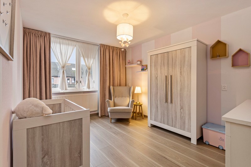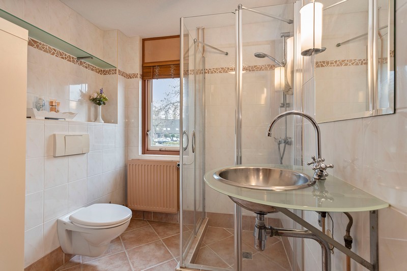 Op de 1e verdieping is gekozen voor de indeling met twee (zeer royale) slaapkamers en op de 2e verdieping vinden we een eveneens zeer ruime derde slaapkamer. Mocht u toch vier slaapkamers nodig hebben? De handige doe-het-zelver kan de indeling eenvoudig wijzigen. De badkamer biedt plaats aan een inloopdouche met glazen wanden, fraaie in glas en chroom uitgevoerde wastafel en handig 2e toilet.