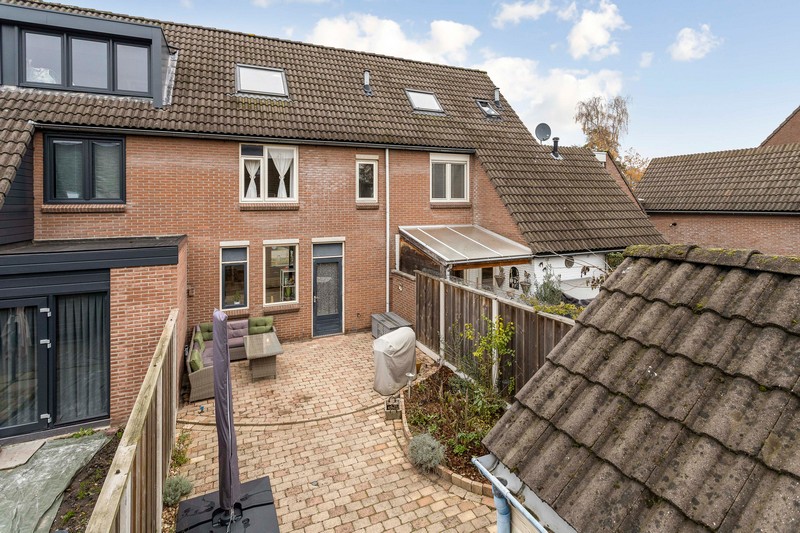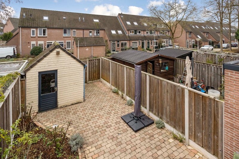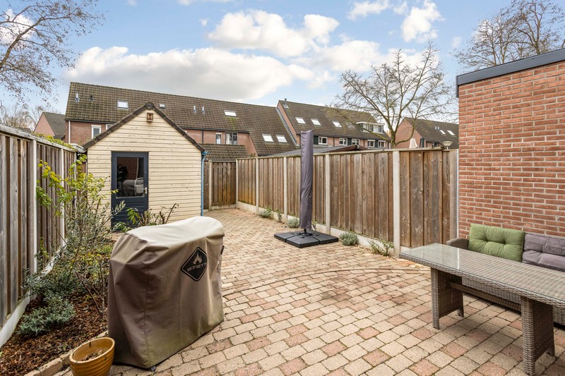 Zowel de voor- als achtertuin zijn onderhoudsarm aangelegd. Strategisch geplaatste boompartijen aan de voorzijde voorkomen de mogelijke inkijk in de woning. De omsloten achtertuin is middels een poort achterom bereikbaar. De tuin is gelegen op de zuidoostzijde, is grotendeels betegeld en de ruime berging biedt plaats aan fietsen en tuinmeubilair. Parkeerplekken zijn er voldoende aan alle zijden van de woning.