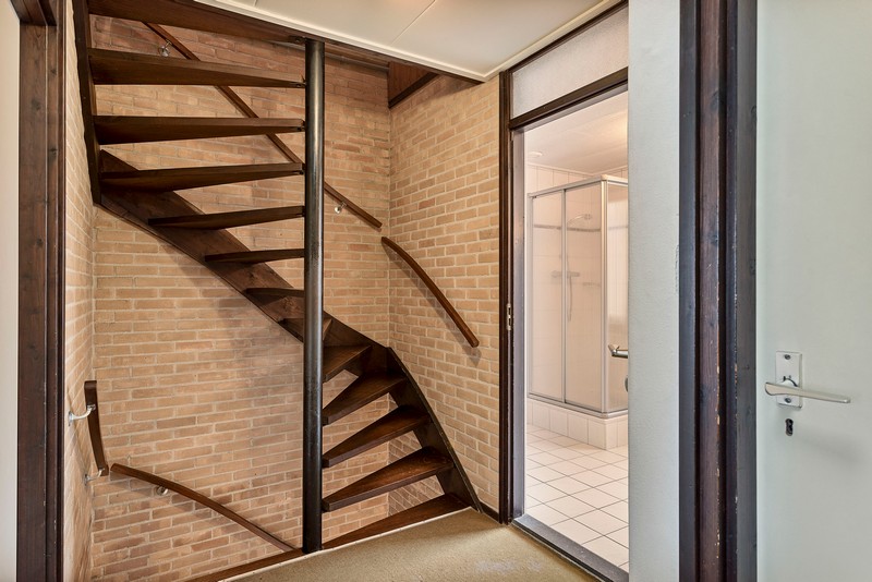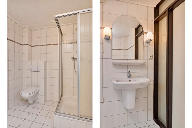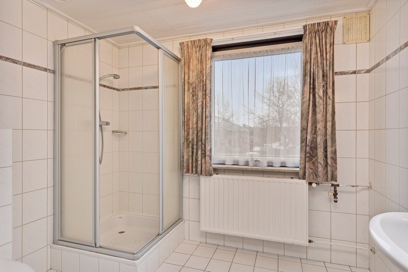Op de eerste verdieping vinden we drie ruime slaapkamers waarvan er twee zijn voorzien van vaste kastruimte. De derde slaapkamer heeft een vaste kast op de overloop die uiteraard ook op een andere manier te gebruiken is. De badkamer is licht betegeld en voorzien van een douchecabine, zwevend toilet en wastafel.