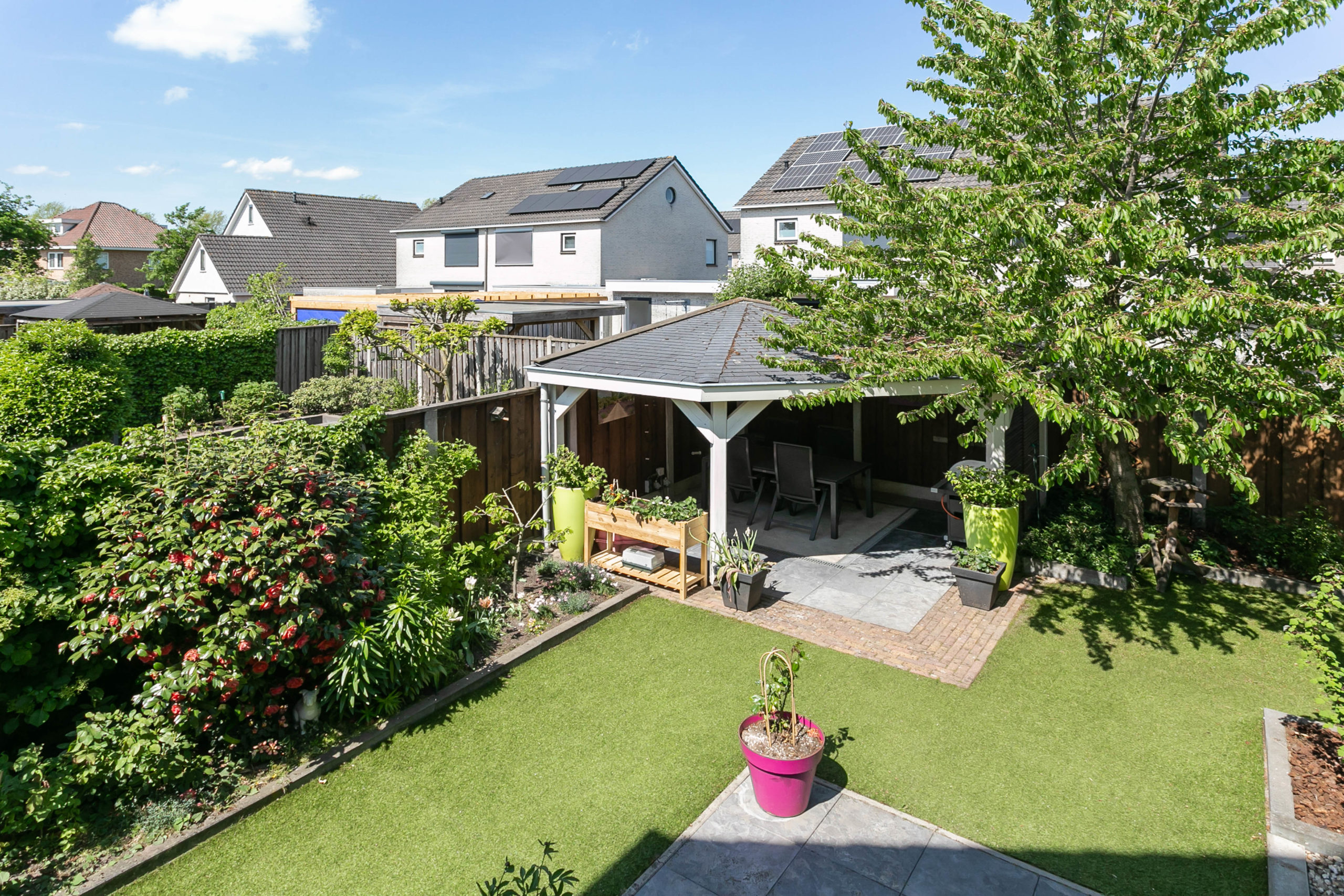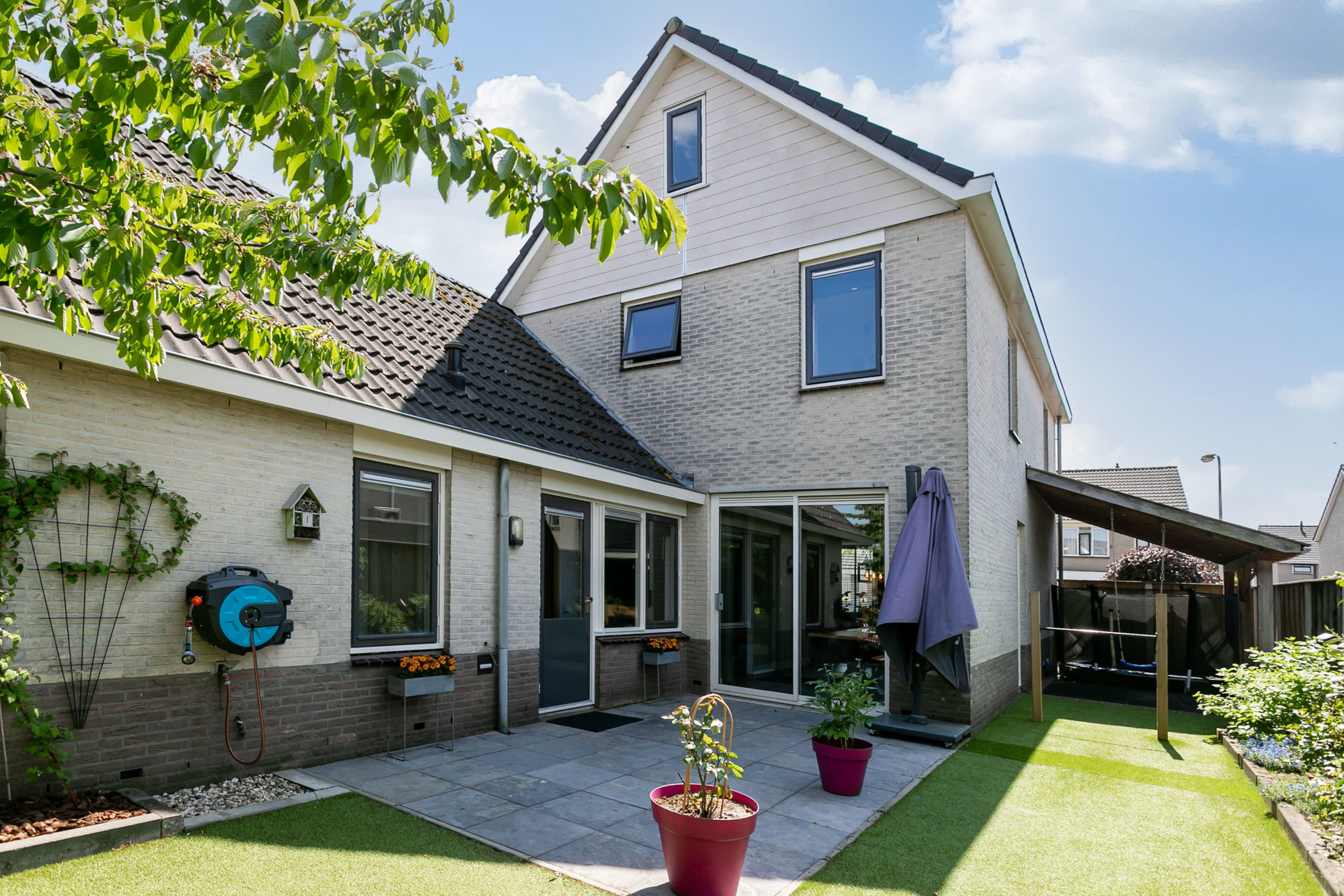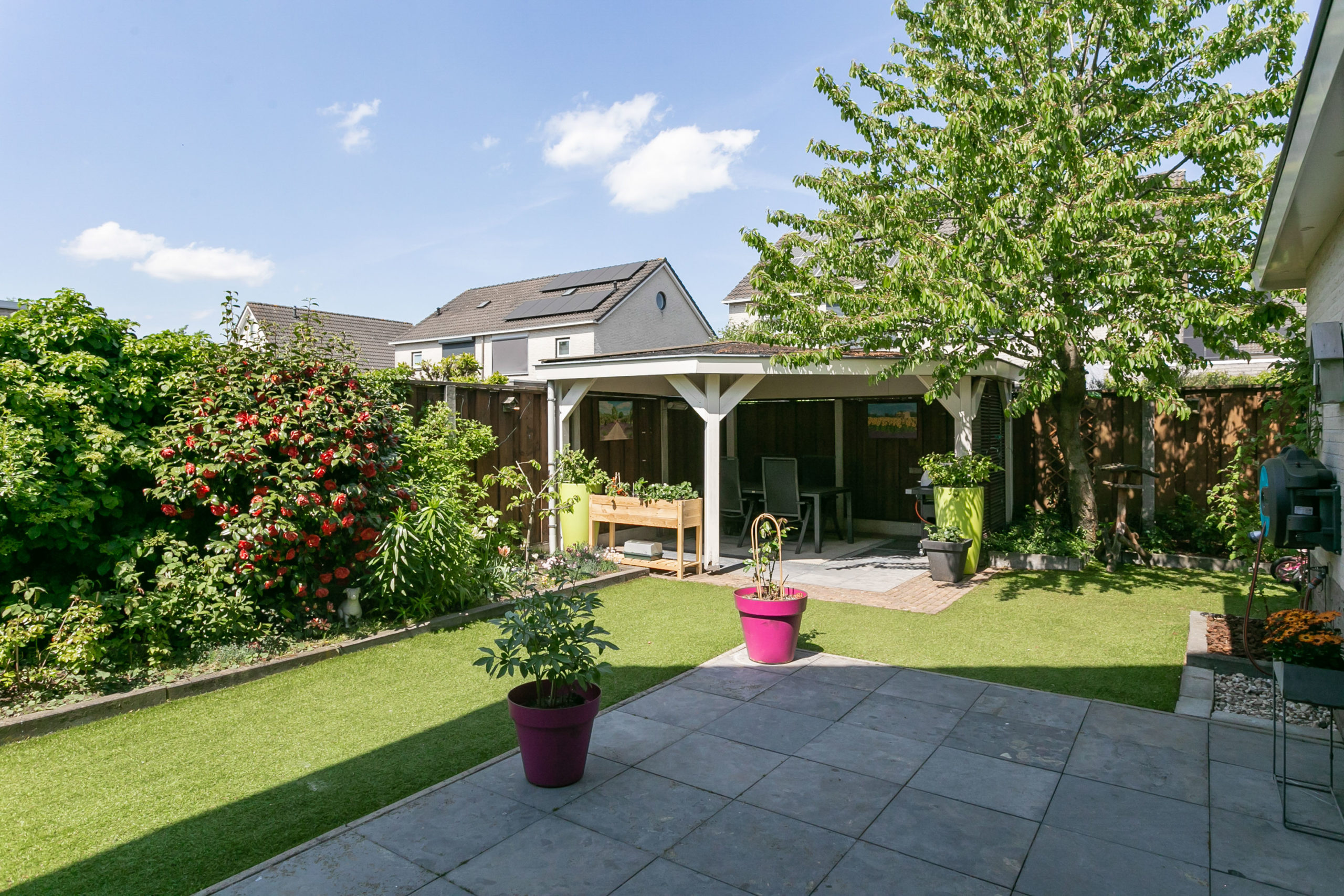 Zowel de voor- als de achtertuin zijn onderhoudsvriendelijk. De achterom is bereikbaar middels een achterom vanaf de Duizendblad. In de tuin vinden we een tuinberging, een ruime overkapping waar je gezellig buiten kunt zitten ook als het een dag iets minder weer is, een handige tweede overkapping waar je het speelgoed van de kinderen kunt bergen of bijvoorbeeld een jacuzzi kunt plaatsen. In de tuin kun je zowel in de zon als schaduw zitten.