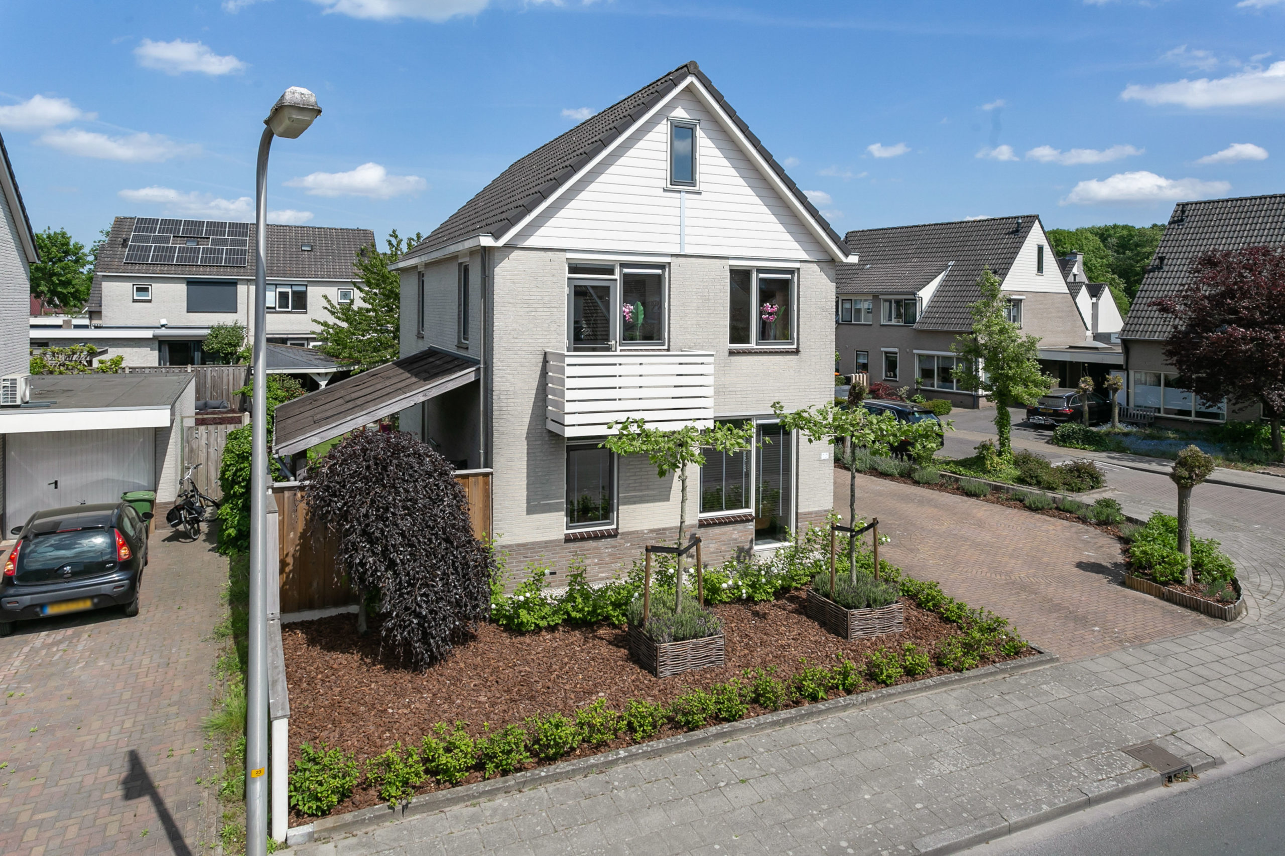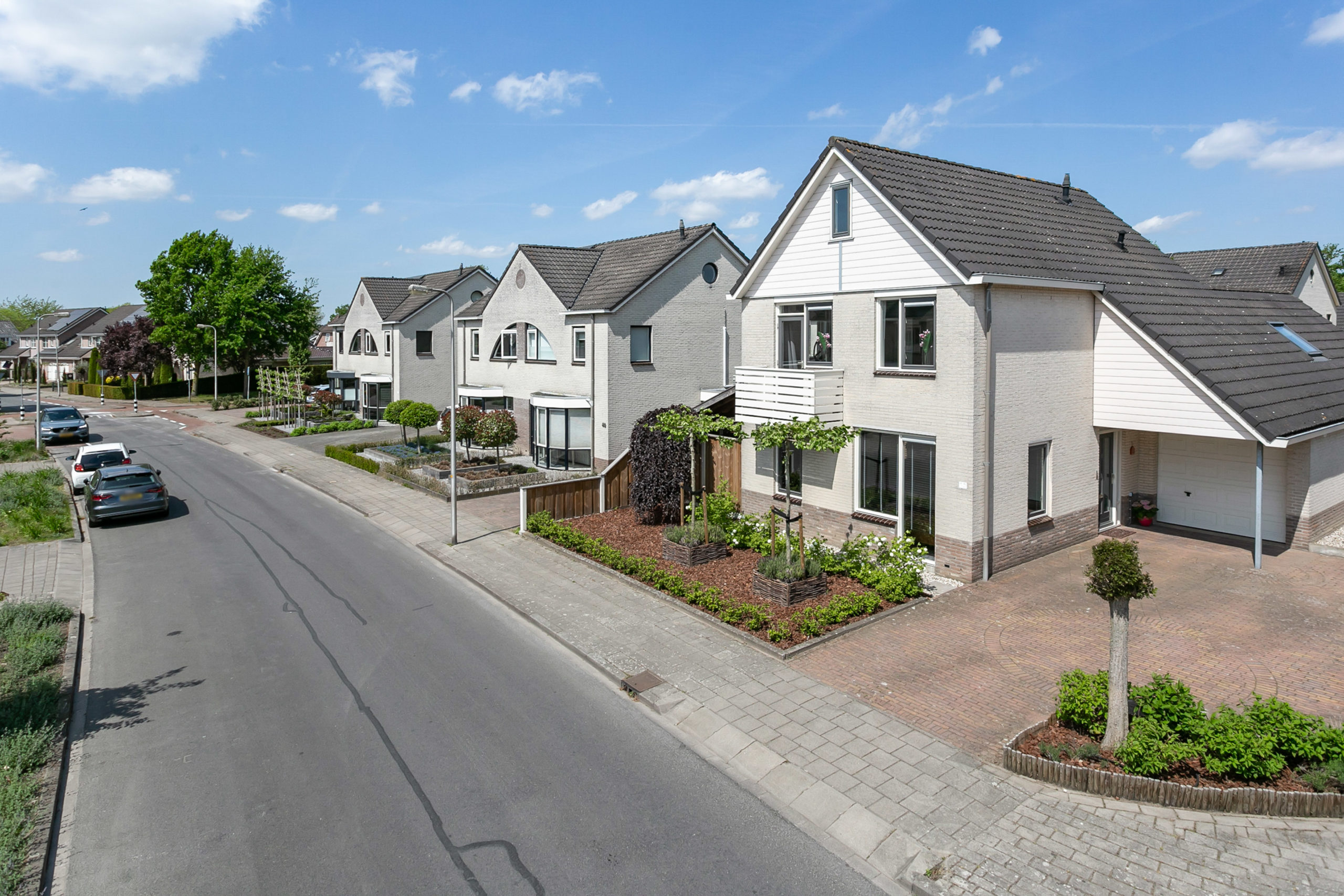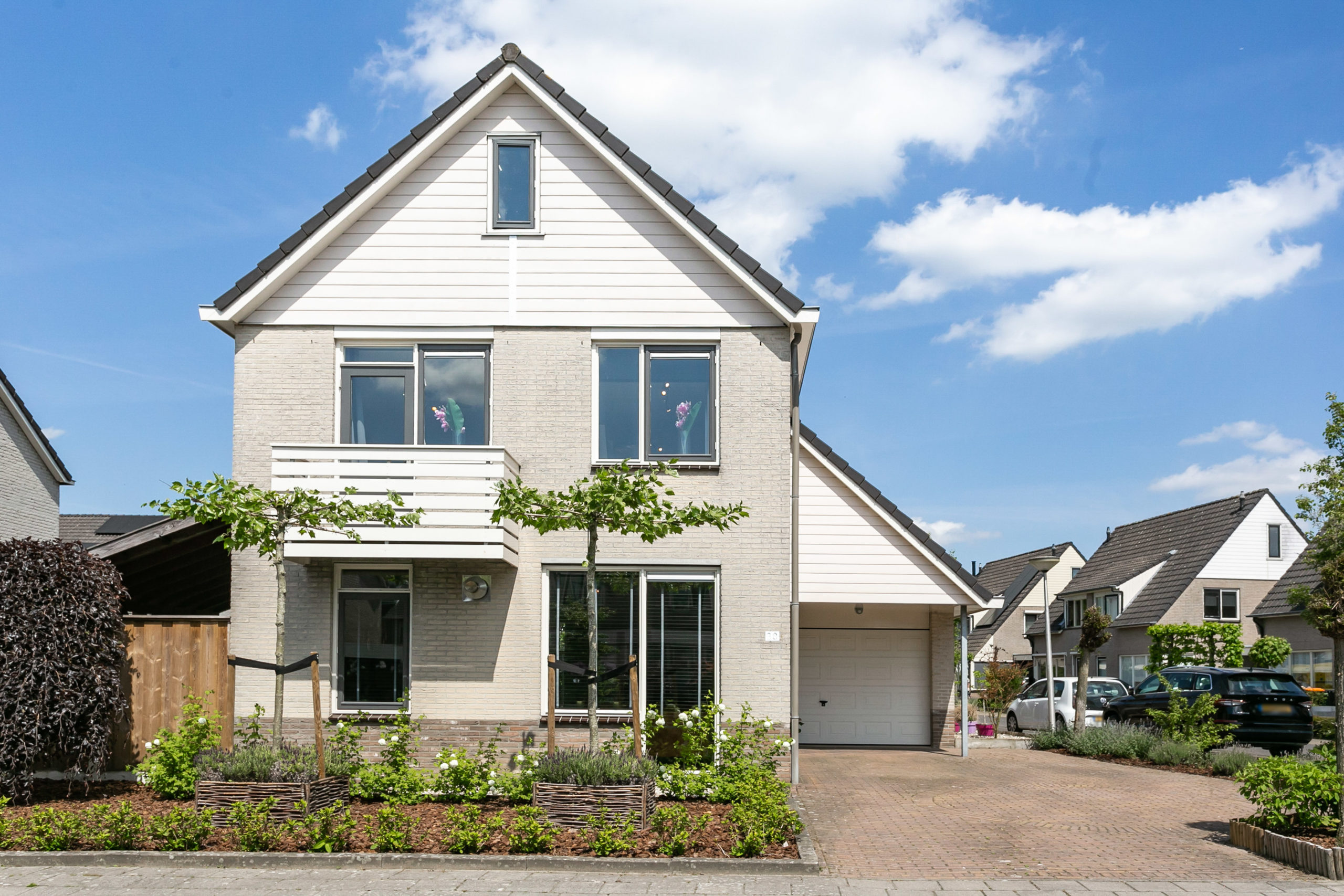 Zowel de voor- als de achtertuin zijn onderhoudsvriendelijk. De achterom is bereikbaar middels een achterom vanaf de Duizendblad. In de tuin vinden we een tuinberging, een ruime overkapping waar je gezellig buiten kunt zitten ook als het een dag iets minder weer is, een handige tweede overkapping waar je het speelgoed van de kinderen kunt bergen of bijvoorbeeld een jacuzzi kunt plaatsen. In de tuin kun je zowel in de zon als schaduw zitten.