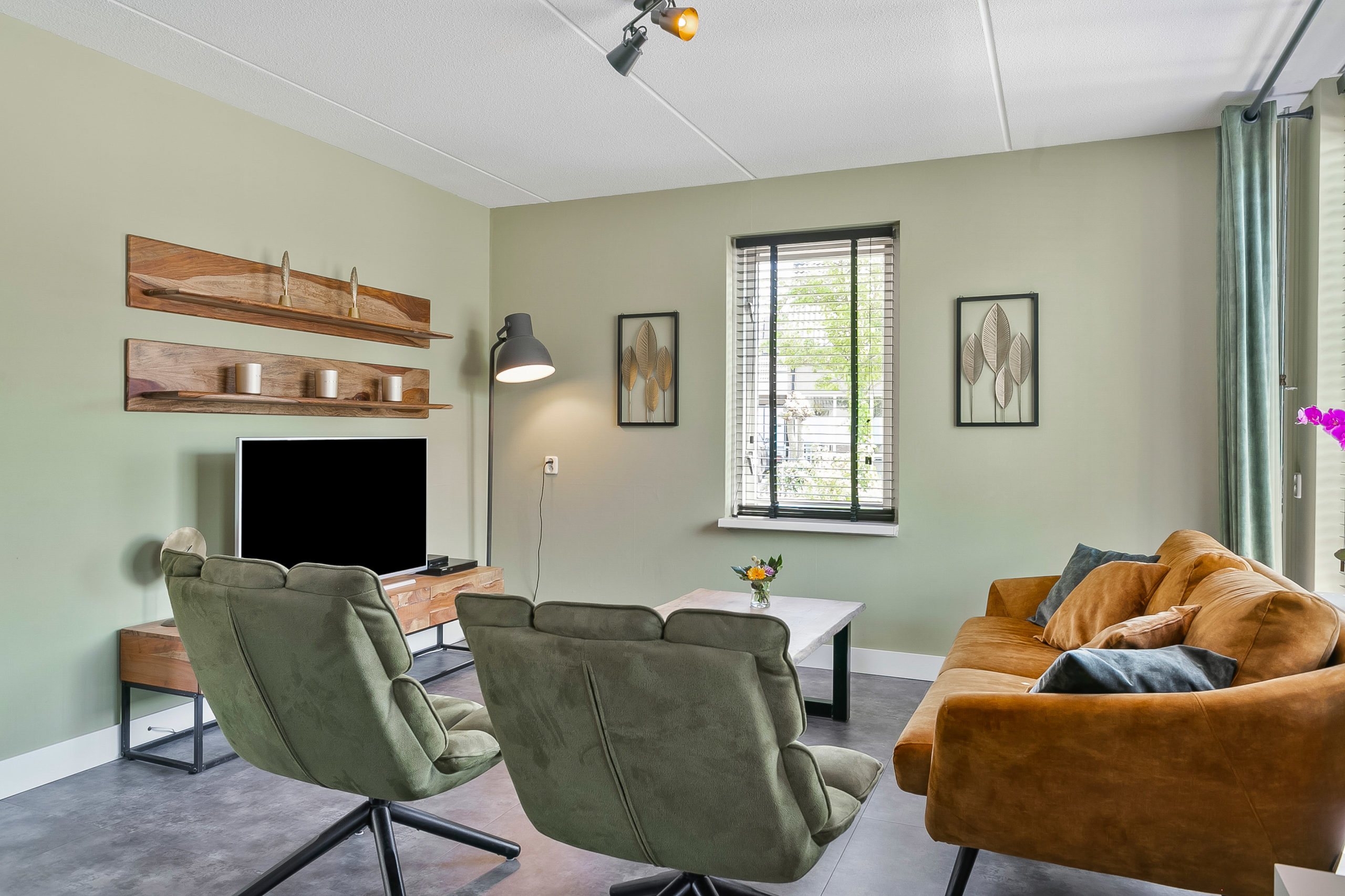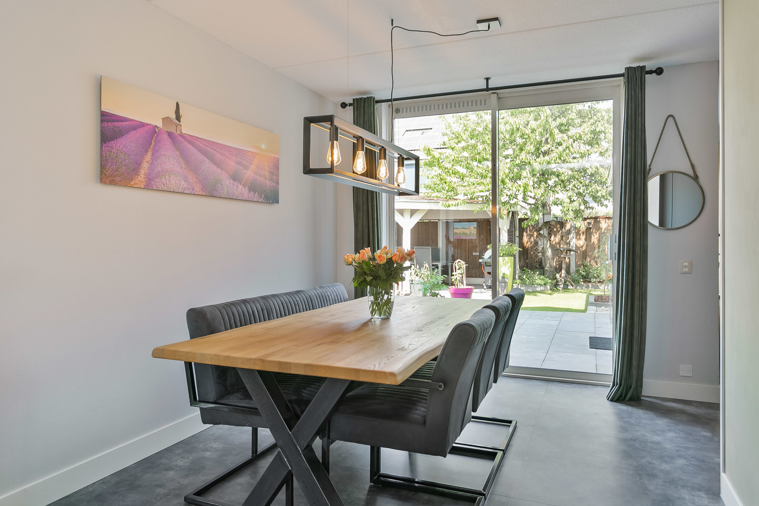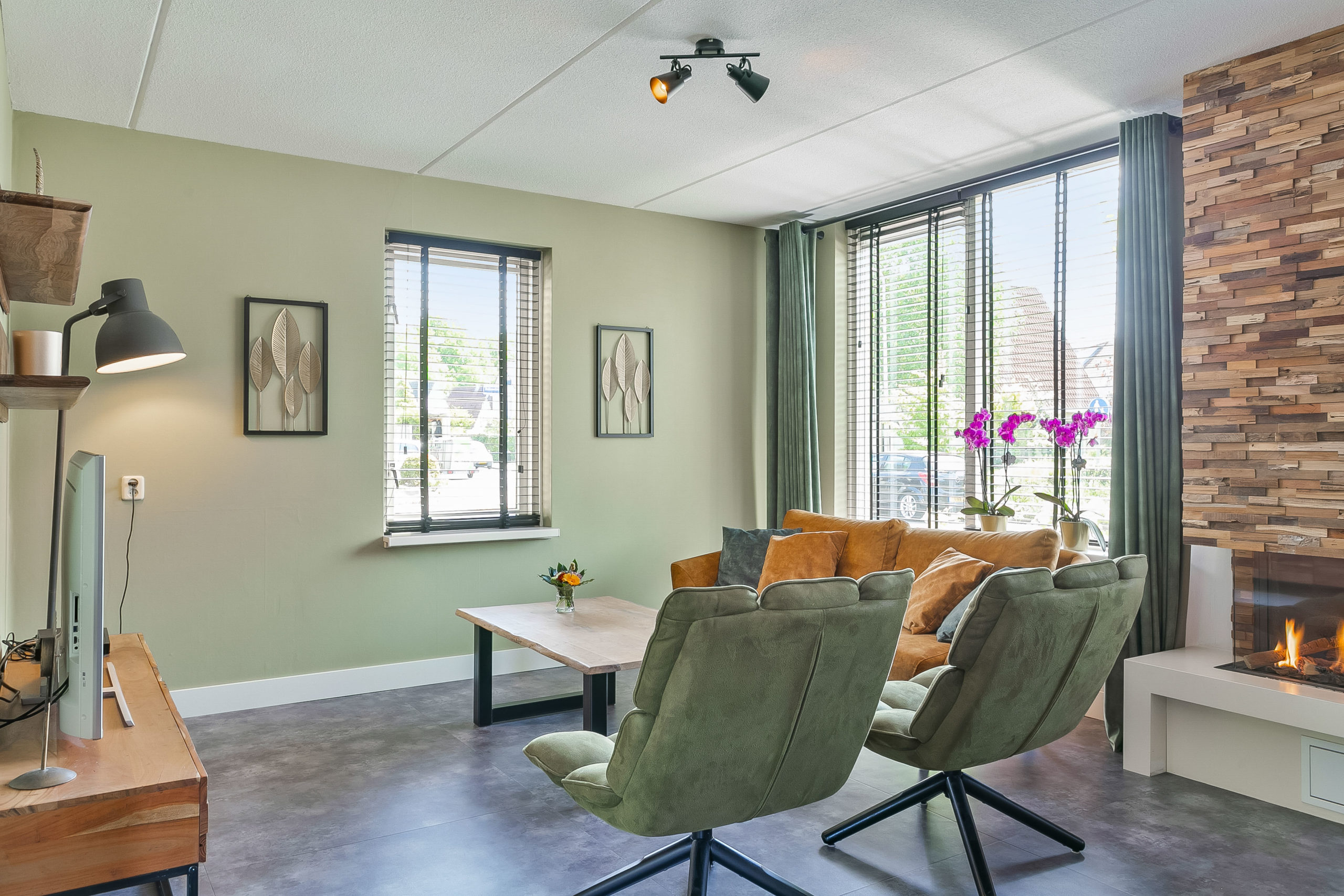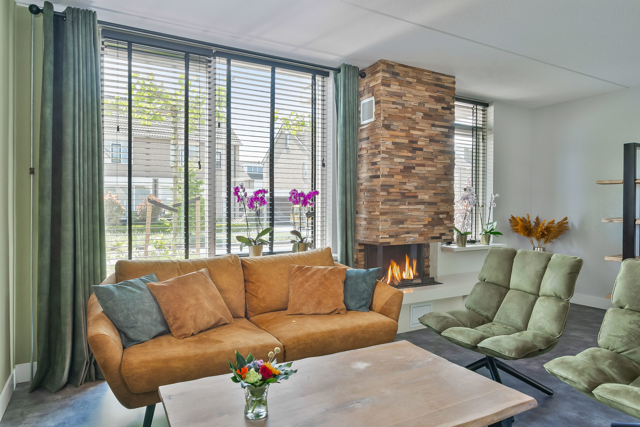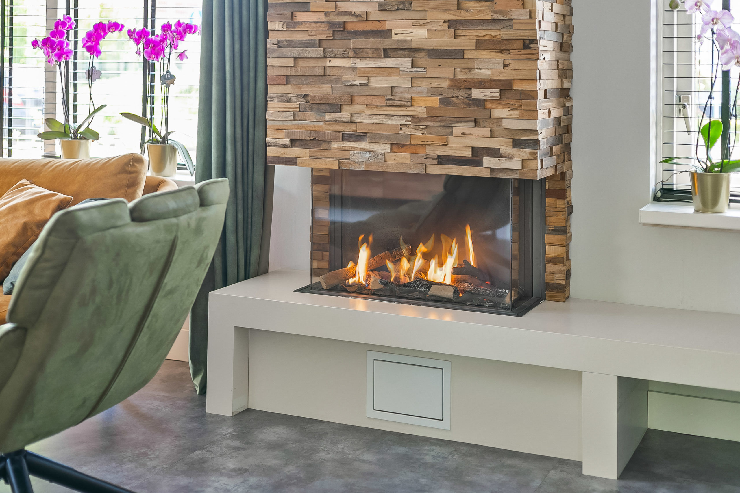 Vanuit de hal met toiletruimte komen we in de L-vormige living. Een moderne PVC vloer van hoogwaardige kwaliteit en rustieke gashaard zorgen voor een prettige sfeer. Dat geldt ook voor de vloerverwarming die in een groot gedeelte van de begane grond aanwezig is. De schuifpui aan de achterzijde verbindt binnen met buiten.