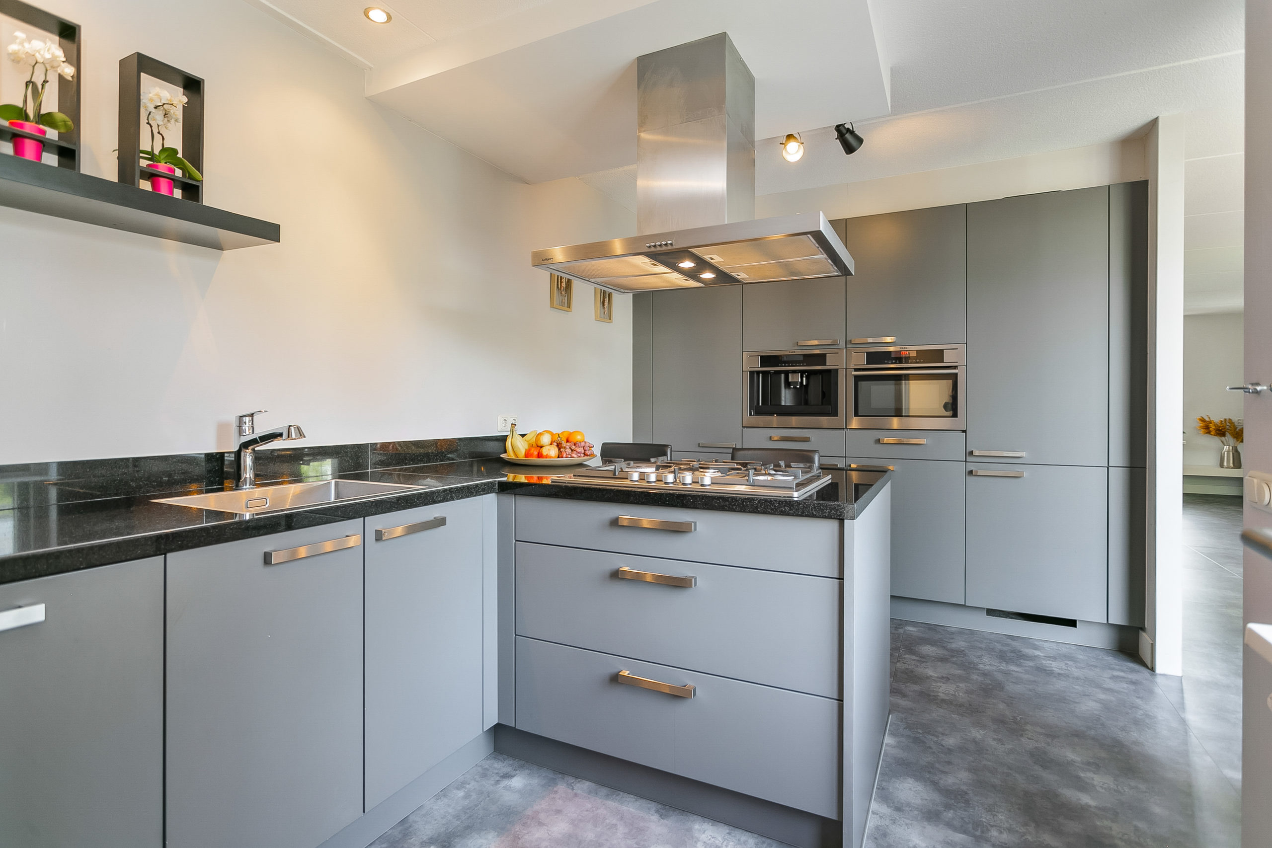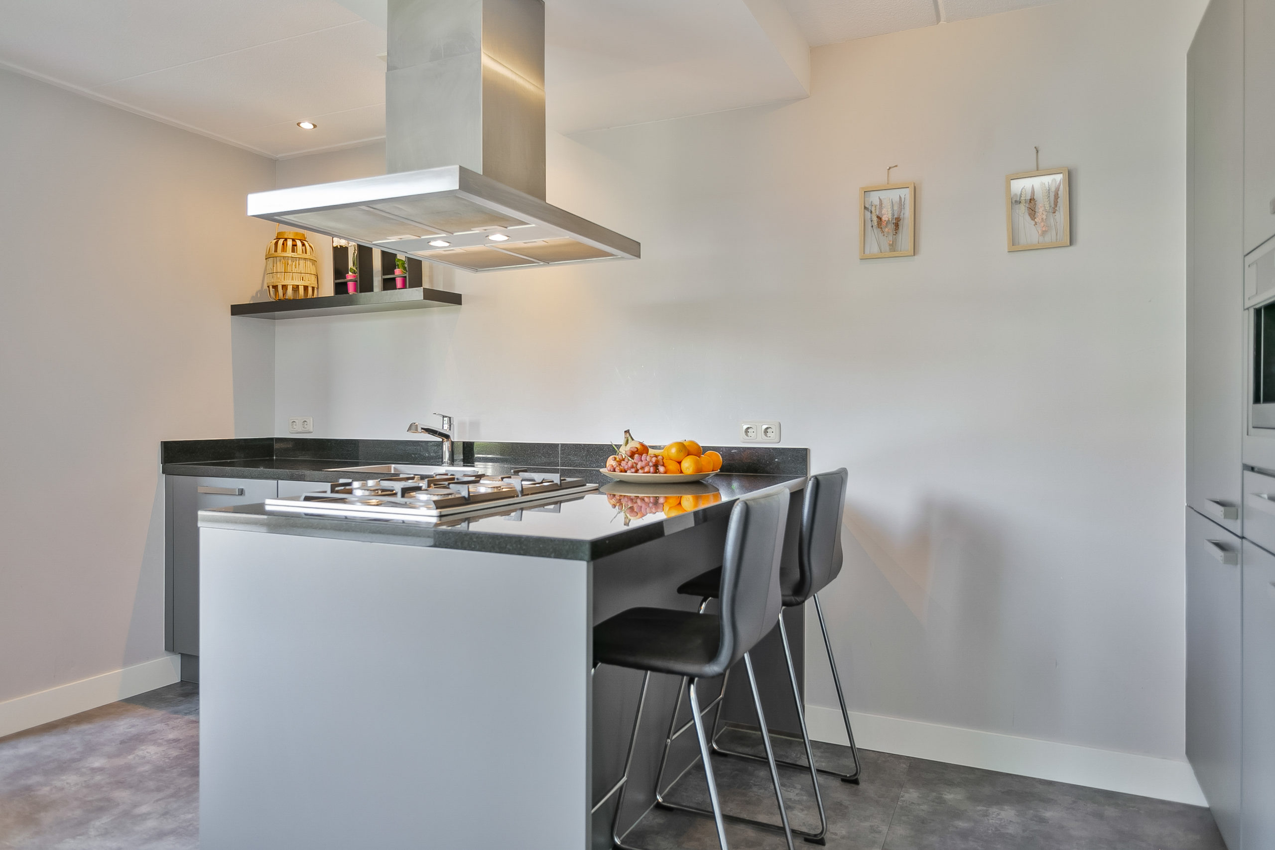 Aan de achterzijde vinden we ook de eveneens moderne inbouwkeuken met granieten werkblad, schiereiland 5-pits gaskookplaat en wokbrander. Aan de wand vinden we een ruimtehoge kastenwand met geïntegreerde keukenapparatuur waaronder een koffiemachine, combimagnetron, koelkast, vriezer en vaatwasser. Met barkrukken aan het eiland wordt koken een gezellig samenzijn van de gehele familie.