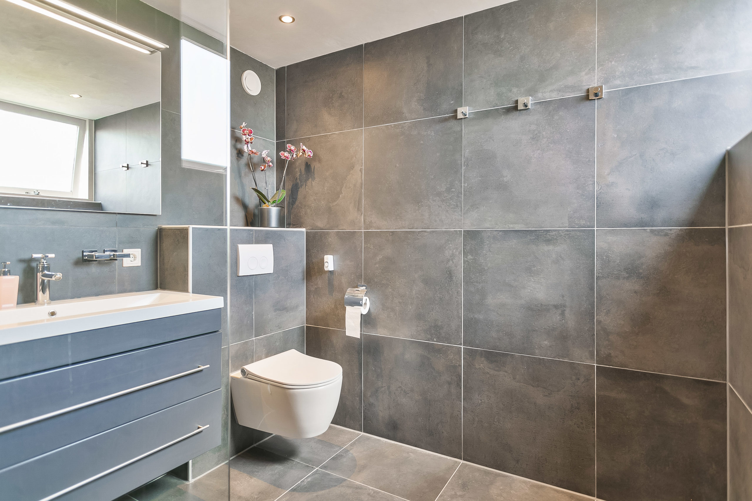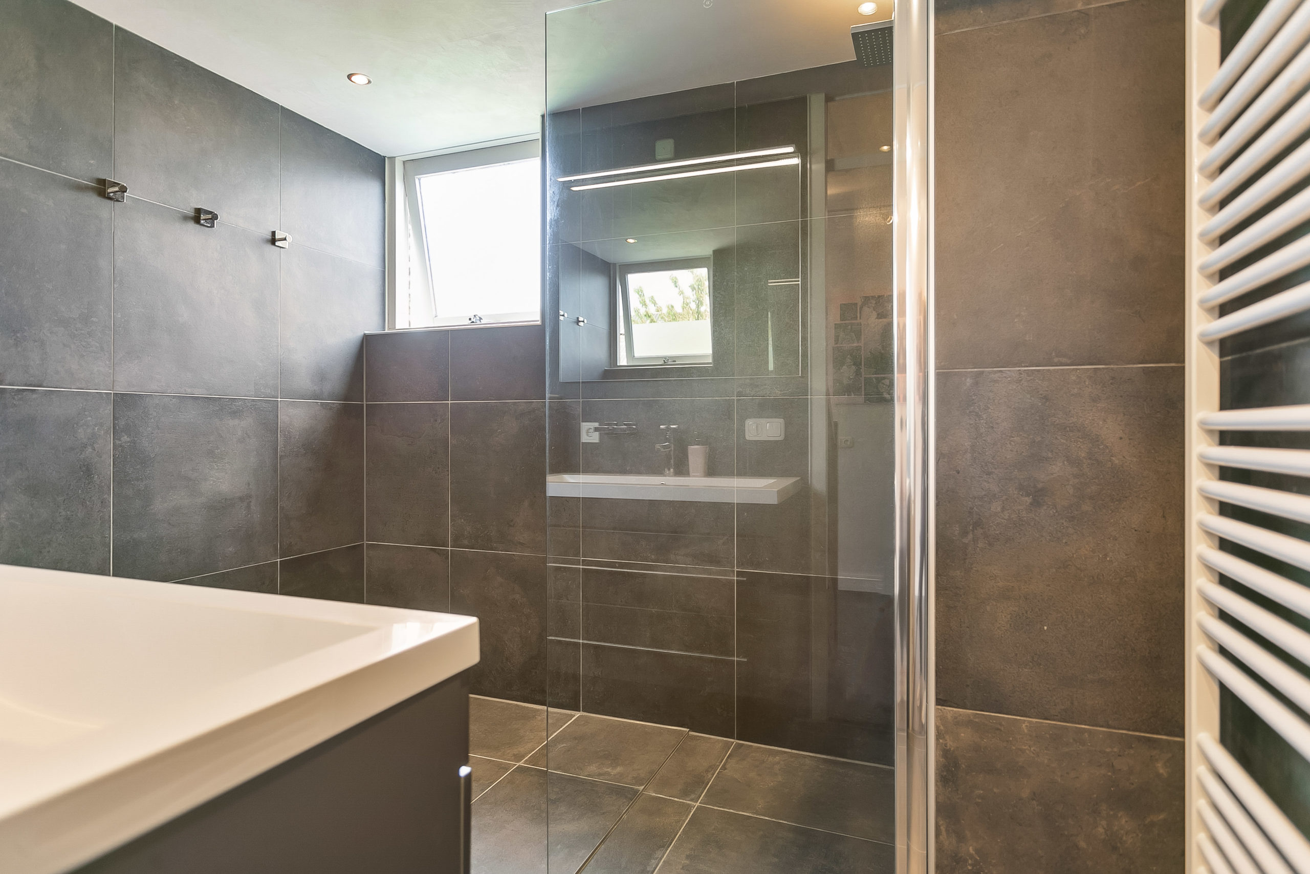 De onlangs gerenoveerde badkamer is in een moderne kleurstelling uitgevoerd en bestaat uit een inloopdouche waar je bij wijze van spreken met het hele gezin tegelijk kan douchen, een extra brede wastafel, een toilet en de vloerverwarming kan natuurlijk ook niet ontbreken.