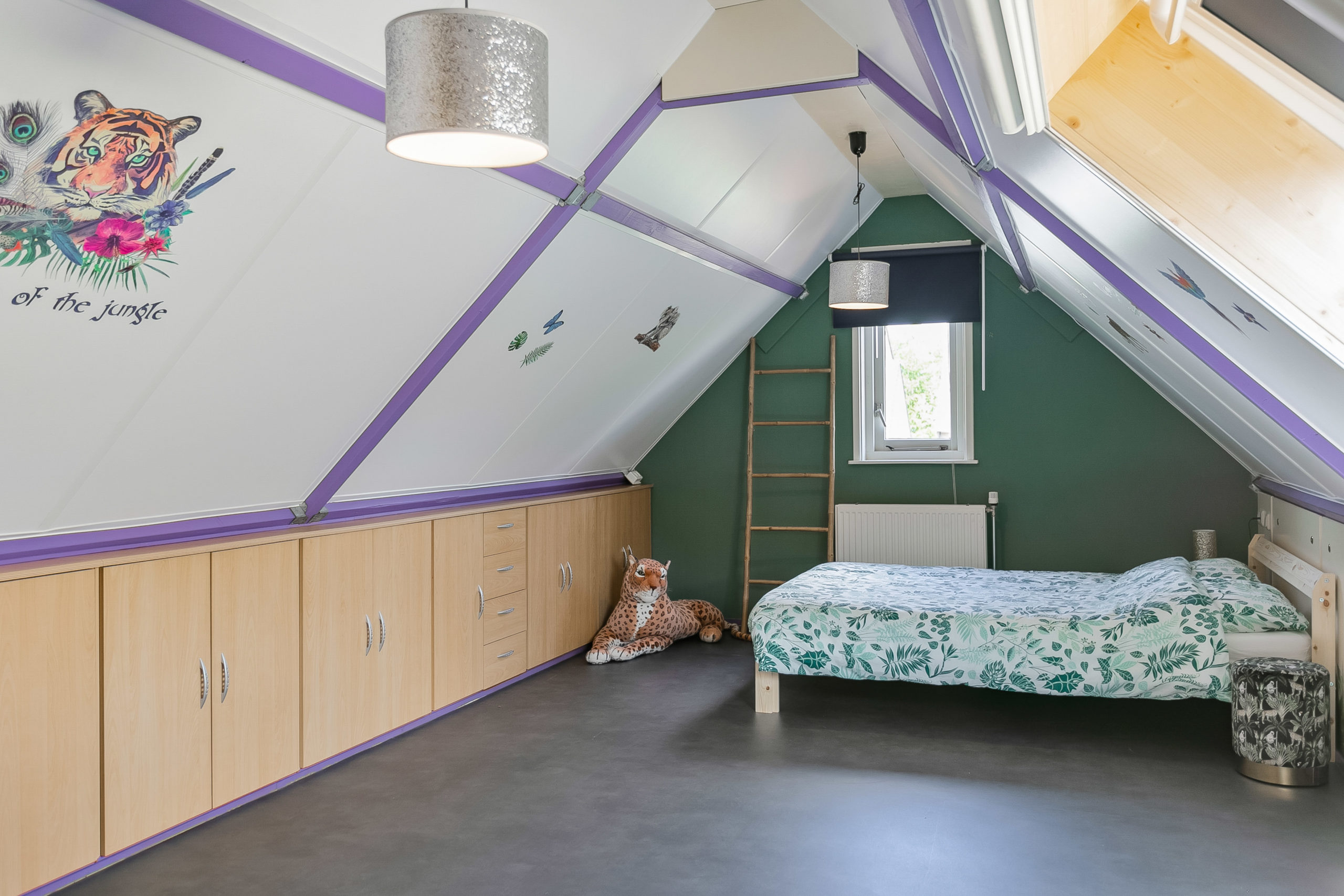 Op de eerste verdieping vinden we 3 hele ruime slaapkamers. De ouderslaapkamer bestaat eigenlijk uit 2 slaapkamers. Vanuit deze kamer is een doorgang gemaakt naar de naastgelegen kamer en deze doet nu dienst als inloopkast. Heeft u deze kamer nodig als slaapkamer? Geen probleem. Met het afsluiten van de doorgang is deze wederom als slaapkamer te gebruiken. De riante ouderslaapkamer heeft ook nog een balkon. Op de aanbouw is een eveneens riante slaapkamer gelegen. Alle schuine kanten zijn afgetimmerd. Aan bergruimte en kasten is derhalve geen gebrek.