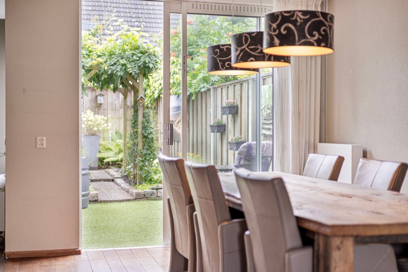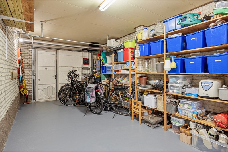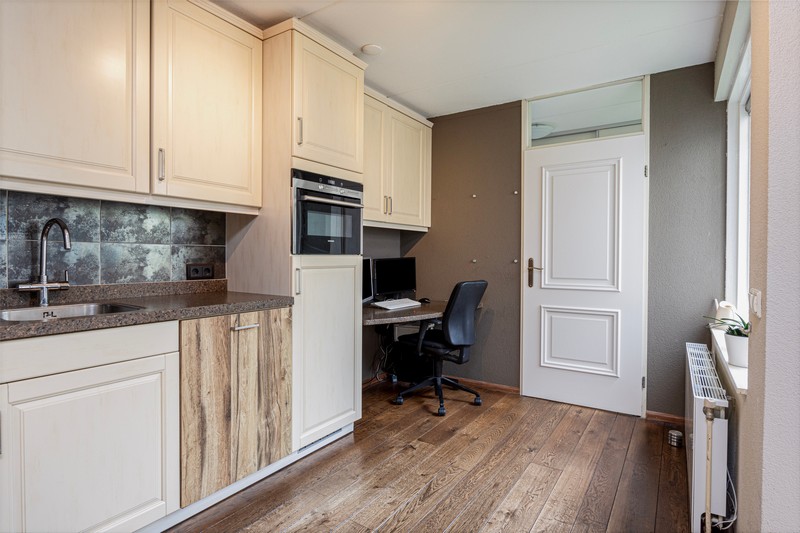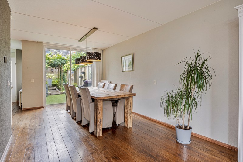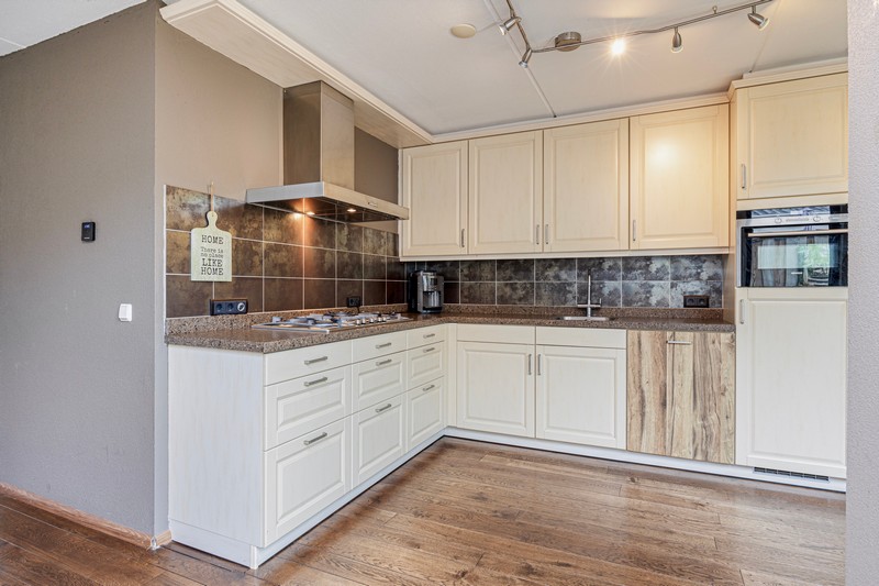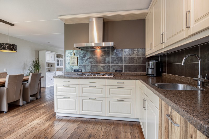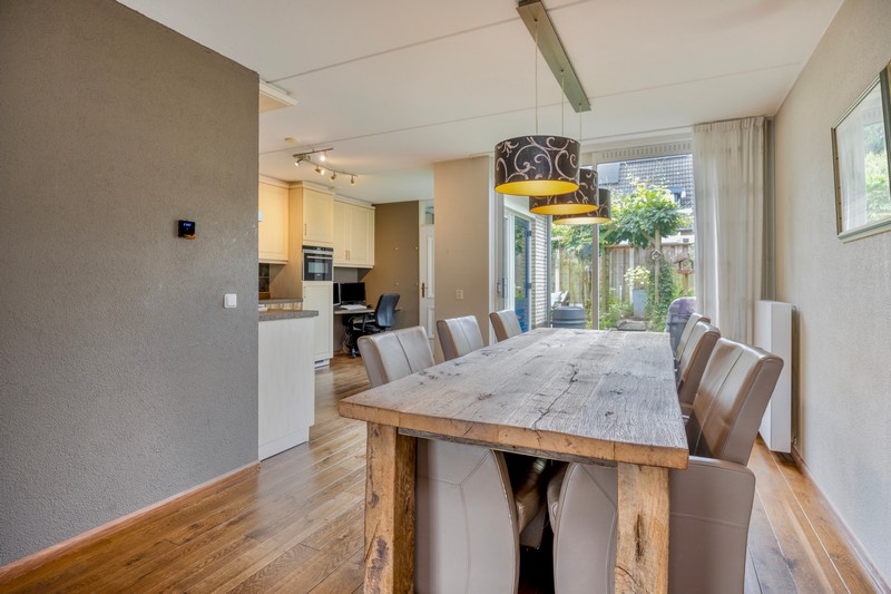 Via de hal met meterkast en toilet komen we in de L-vormige woonkamer met massief houten vloer en schuifpui naar het terras. De (inbouw)keuken zit om de hoek, uit het zicht van de woonkamer. De keuken is voorzien van een granieten blad, 4-pits gaskookplaat met wokbrander, afzuiging, koelkast, combimagnetron en vaatwasser. Via de bijkeuken met vast kastruimte en aansluitingen voor de wasmachine en -droger komen we in de garage die zowel via de voor- als achterzijde en binnenuit te bereiken is.