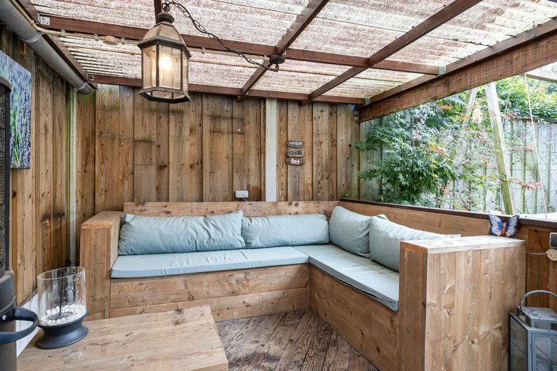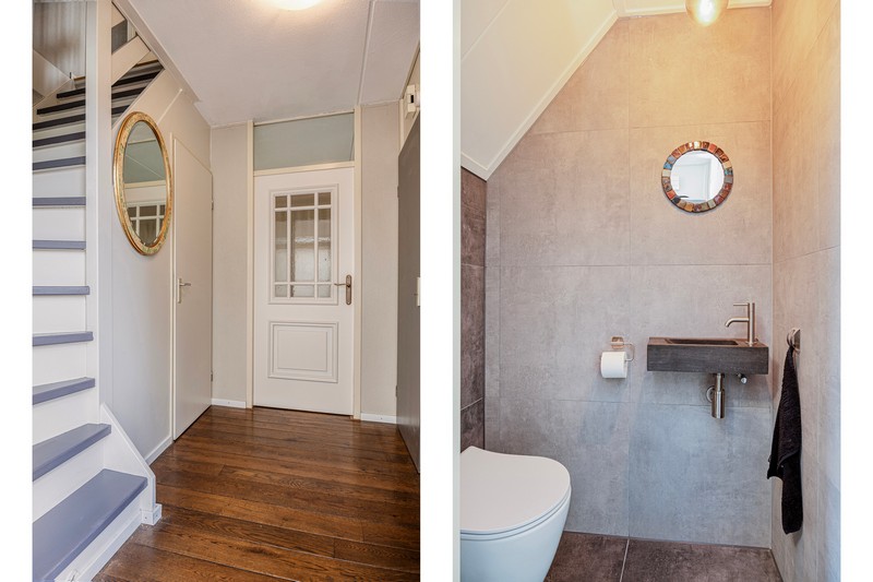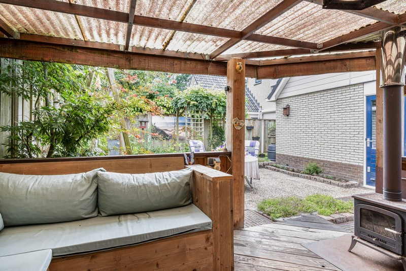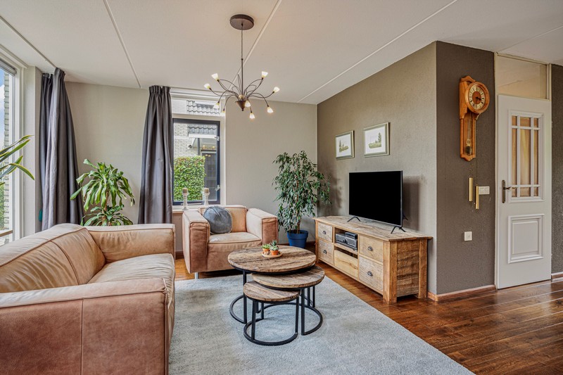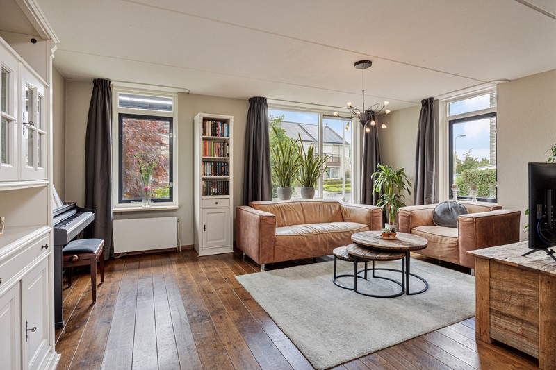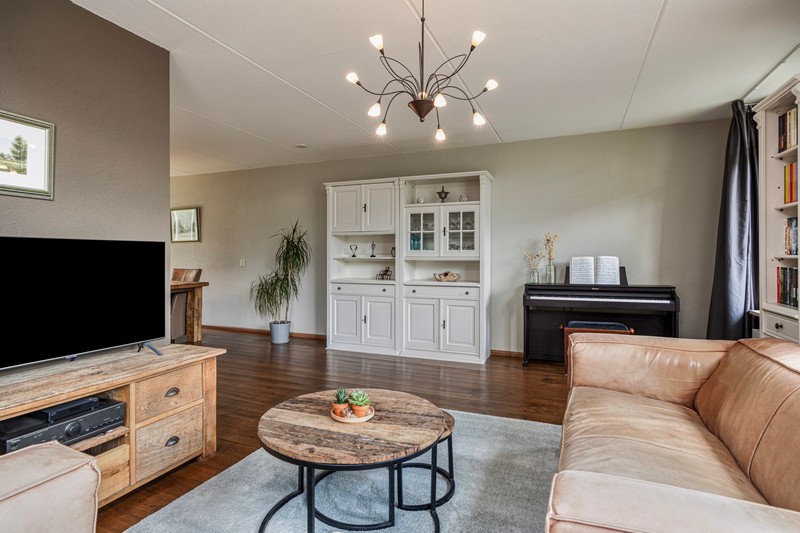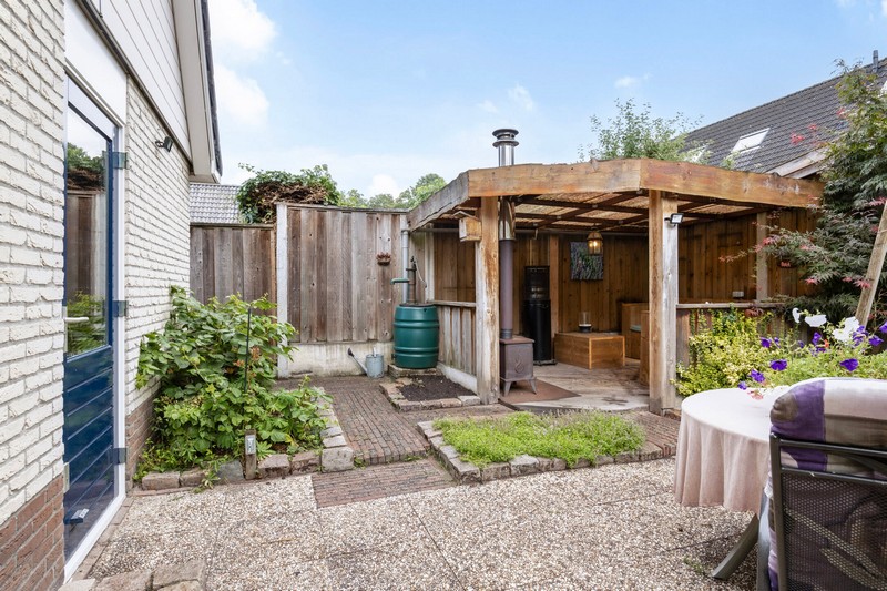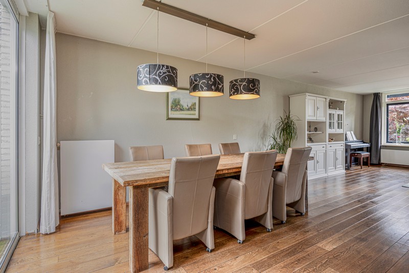 Via de hal met meterkast en toilet komen we in de L-vormige woonkamer met massief houten vloer en schuifpui naar het terras. De (inbouw)keuken zit om de hoek, uit het zicht van de woonkamer. De keuken is voorzien van een granieten blad, 4-pits gaskookplaat met wokbrander, afzuiging, koelkast, combimagnetron en vaatwasser. Via de bijkeuken met vast kastruimte en aansluitingen voor de wasmachine en -droger komen we in de garage die zowel via de voor- als achterzijde en binnenuit te bereiken is.