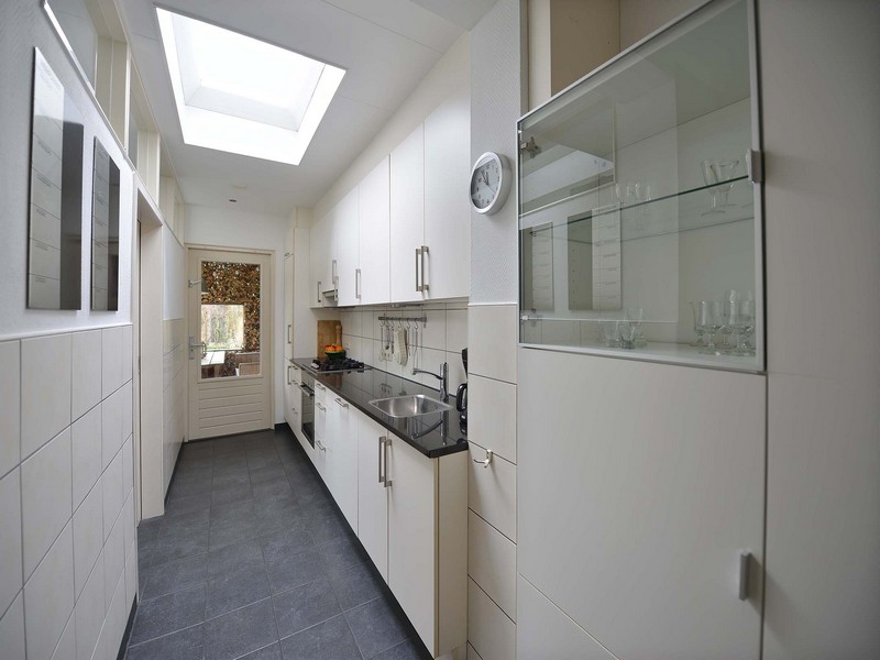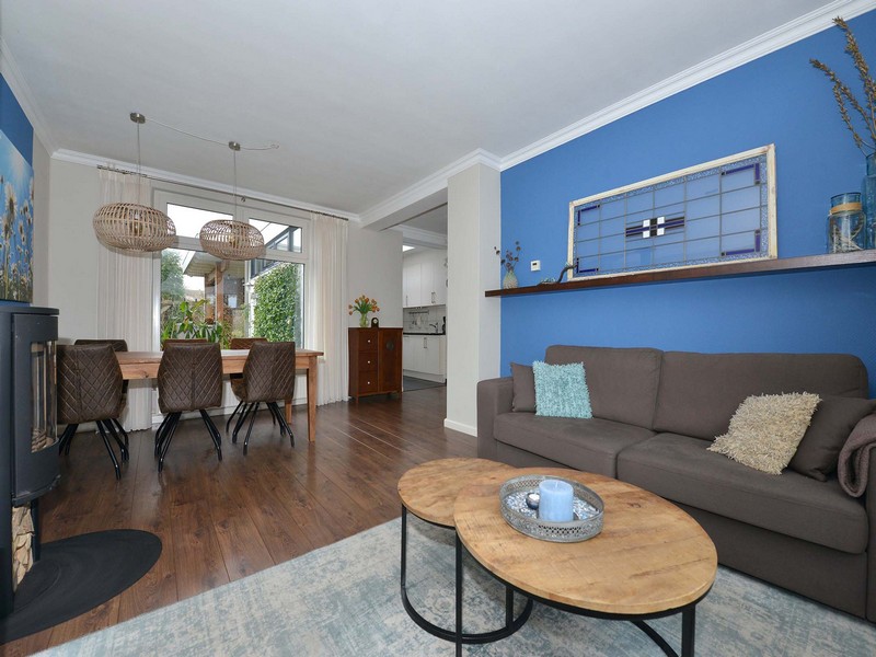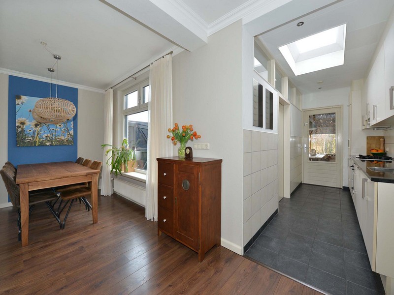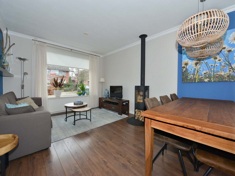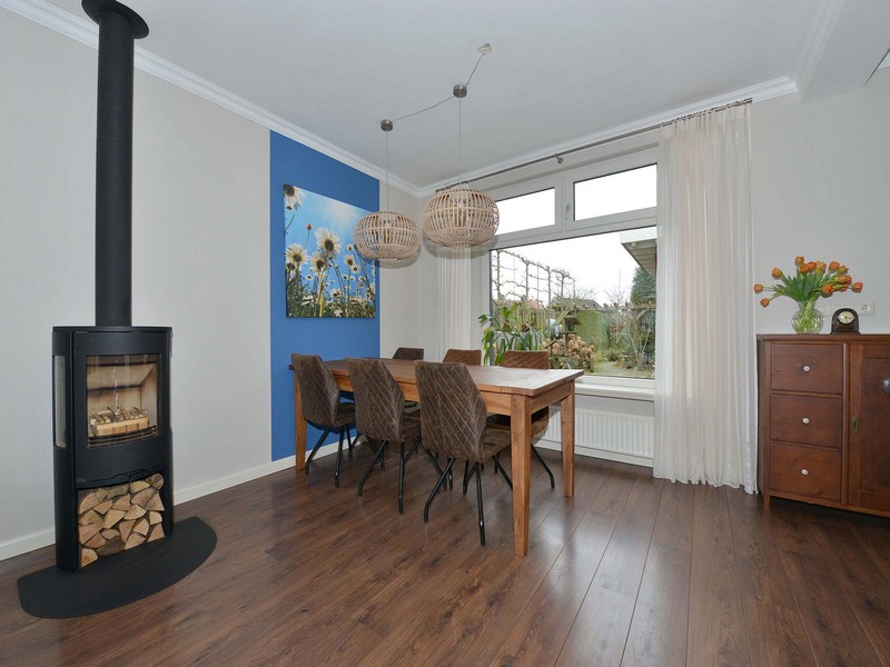 De woning is in 2007 aan de achterzijde uitgebouwd ten behoeve van een keuken en bijkeuken en in 2015 is een overkapping aangebouwd. De voormalige keukenruimte is bij de woonkamer aangetrokken waardoor een fraaie L-vormige woonkamer is ontstaan welke voorzien is van een rookkanaal voor een gezellige haard. De keuken met moderne inbouwkeuken is voorzien van een granieten blad, gaskookplaat, afzuiging, oven, koelkast en vaatwasser. De hal met toilet, meterkast en kelderkast vinden we uiteraard aan de voorzijde.