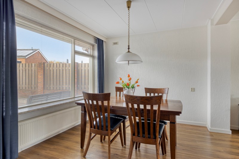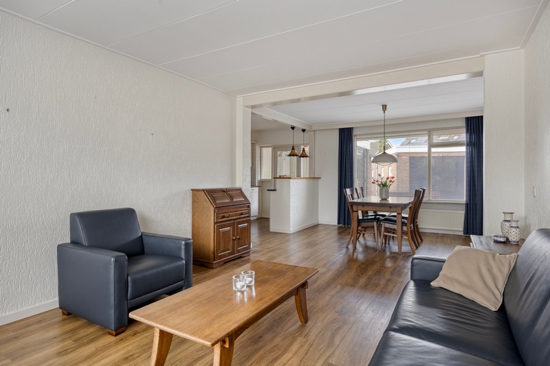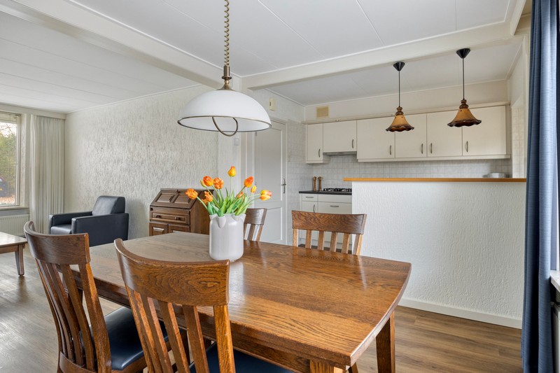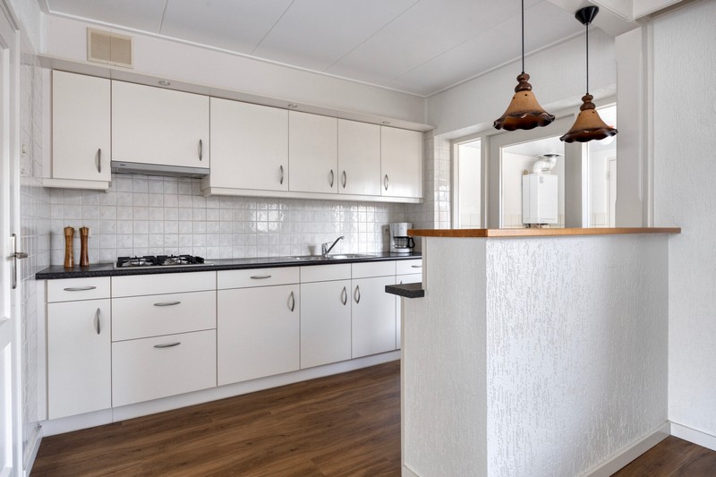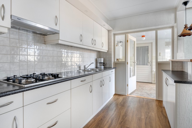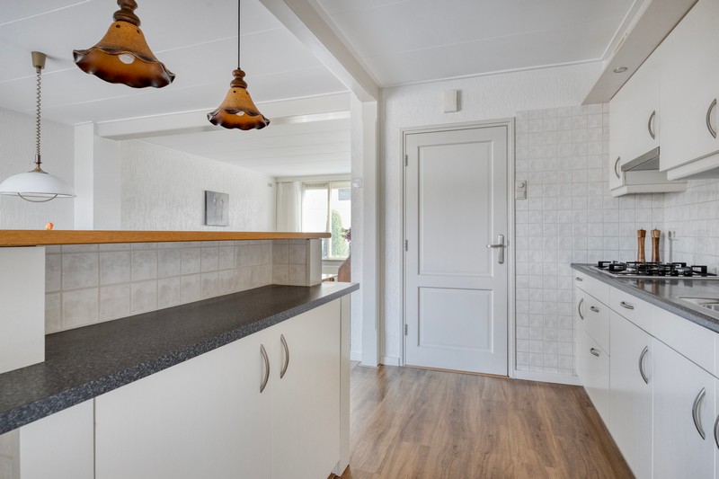 Volgens goed Twents gebruik komen we via de achterentree/bijkeuken binnen. Aan de rechterzijde vinden we de berging. Aan de linkerzijde komen we in de keuken die voorzien is van een lichte inbouwkeuken met donker gekleurd aanrechtblad en inbouwapparatuur. Een barretje met handige kastruimte scheidt de keuken van de doorzon woonkamer met grote ramen aan de voorzijde en achterzijde waardoor het heerlijk licht is in de woning.