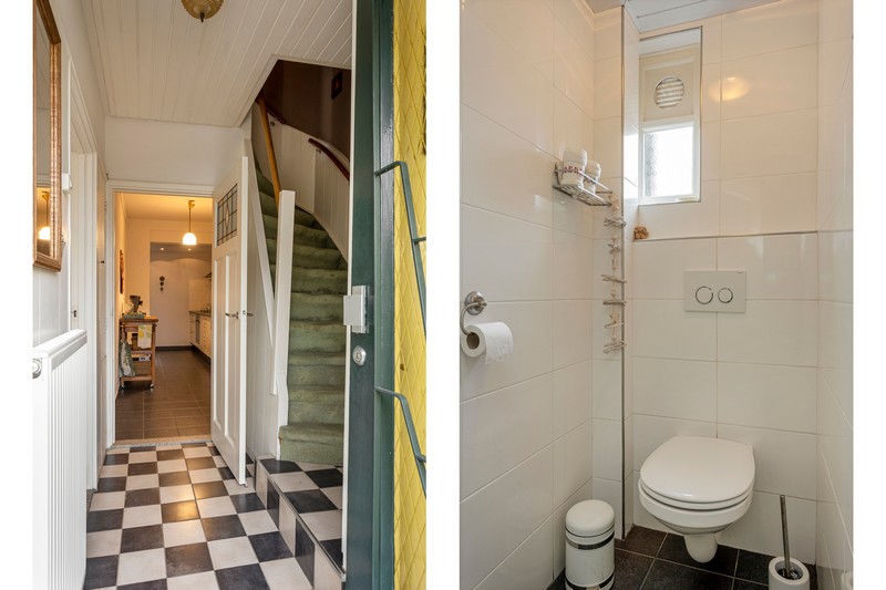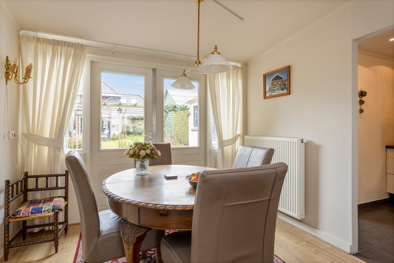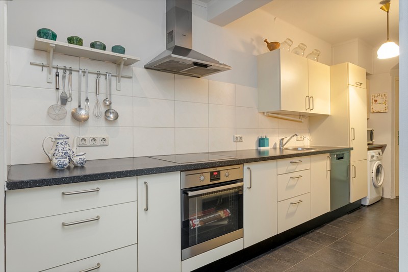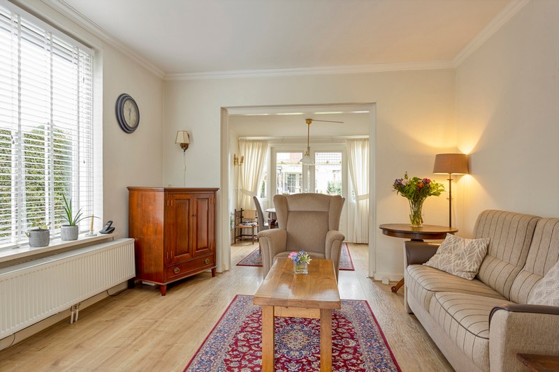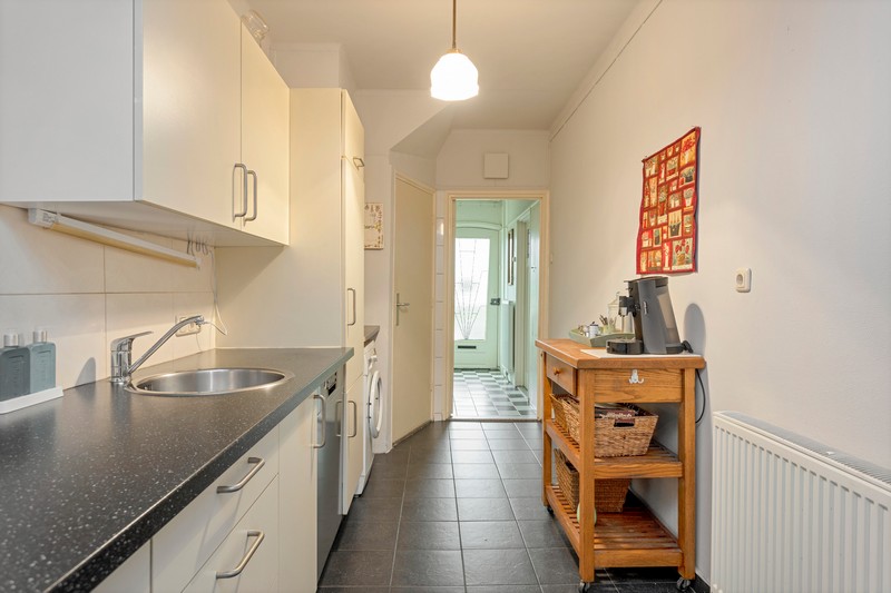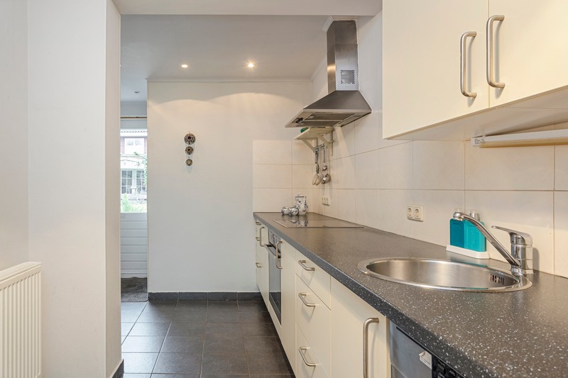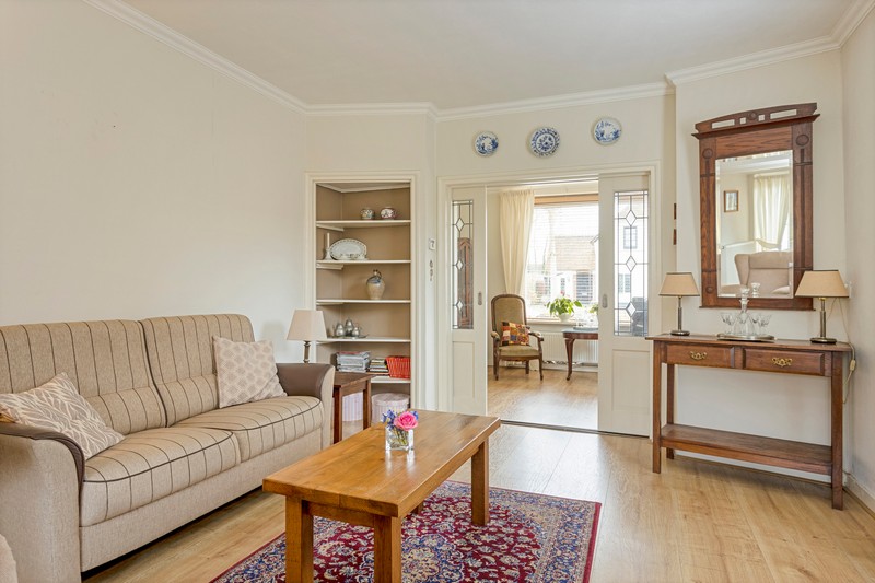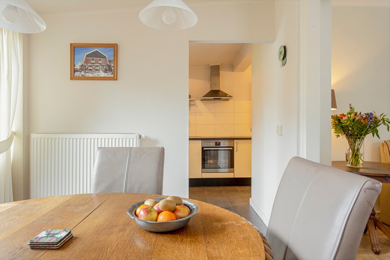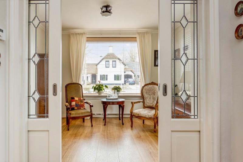 Via de hal met toilet en provisiekelder komen we in de kamer en suite. Wat een sfeer! De suitedeuren met glas-in-lood en in facet geslepen glas, scheiden voor- en achterkamer. Aan weerszijden ervan vinden we rookkanalen en kastruimte. De kamer is aan de achterzijde uitgebouwd ten behoeve van een tuinkamer met dubbele openslaande deuren. De dichte keuken is voorzien van een lichte, in 2010 geplaatste, inbouwkeuken met keramische kookplaat, afzuiging, oven, koelkast en vaatwasser. Achter de keuken vinden we nog het portaal naar de tuin waar ook de CV-ketel geplaatst is.
