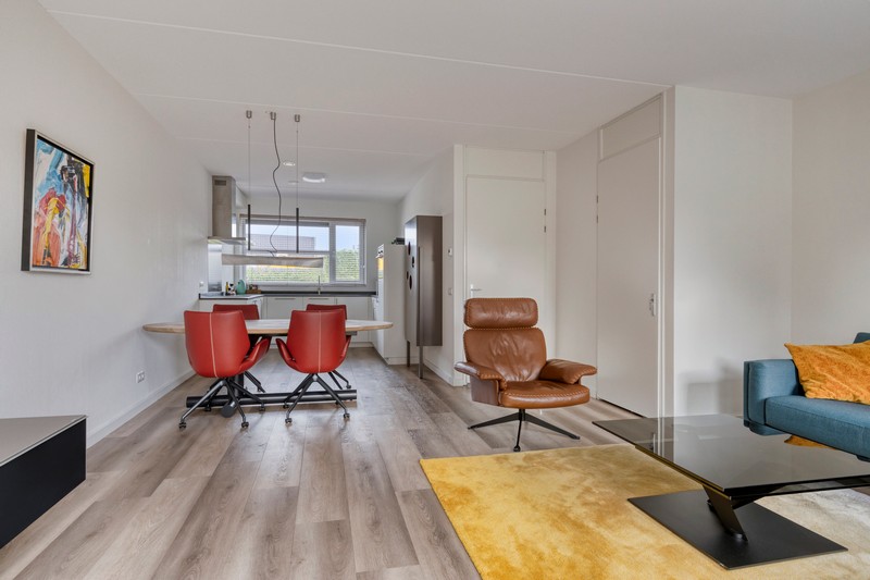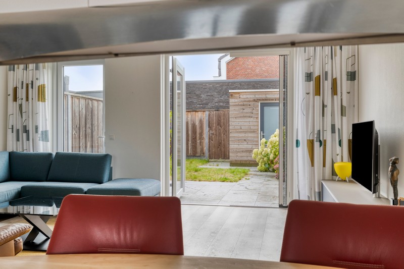 De woonkamer aan de achterzijde heeft een gezellige zithoek, is modern en sfeervol. De grote raampartijen en tuindeuren verbinden binnen en buiten met elkaar, zorgen voor een fijne lichtinval en geven een ruimtelijk gevoel.