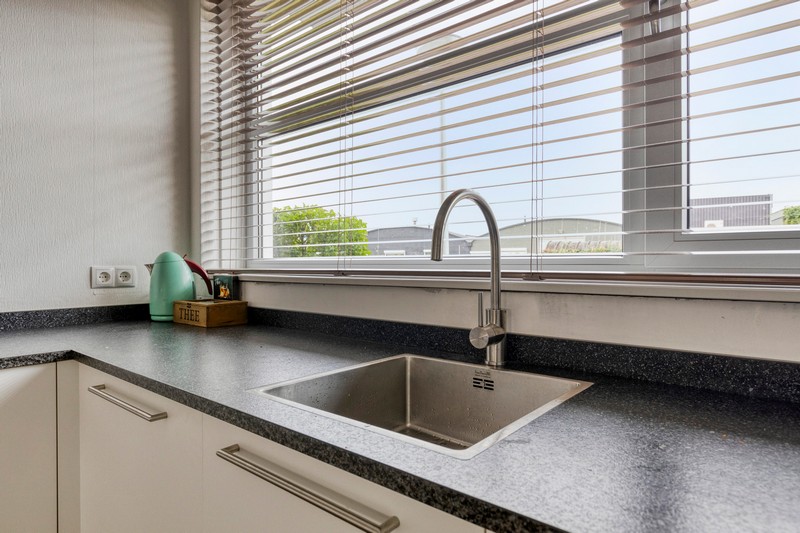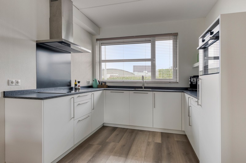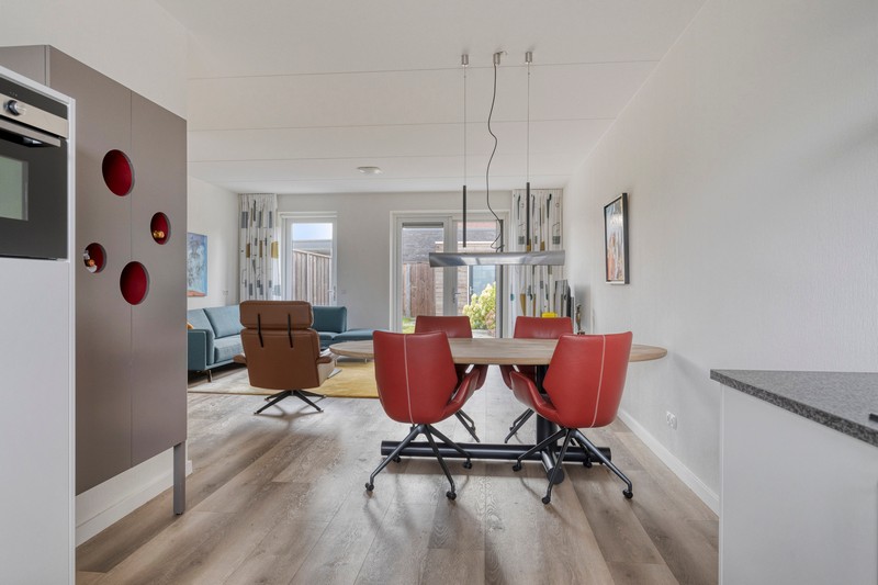 De moderne keuken bevindt zich aan de voorzijde, met veel daglicht door het grote keukenraam. De keuken heeft een goede werkruimte en is voorzien van inductiekookplaat, afzuiging, ruime spoelbak, combi-oven, koelkast en veel kastruimte. Een fijn plek zodat je er heerlijk kunt koken.