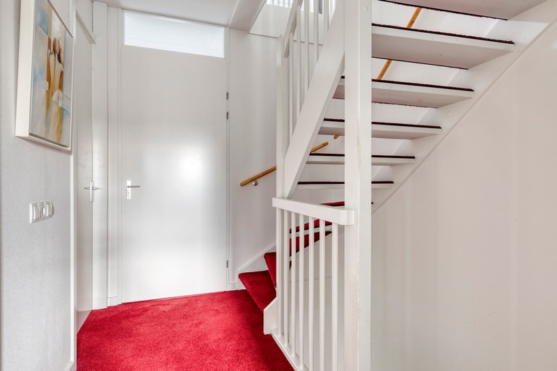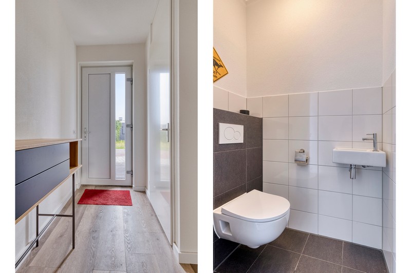 Je wordt ontvangen in een ruime hal met toiletruimte. Hier bevindt zich de trapopgang naar de eerste verdieping en toegang tot de tuingerichte woonkamer en straatgerichte keuken.