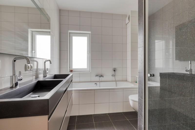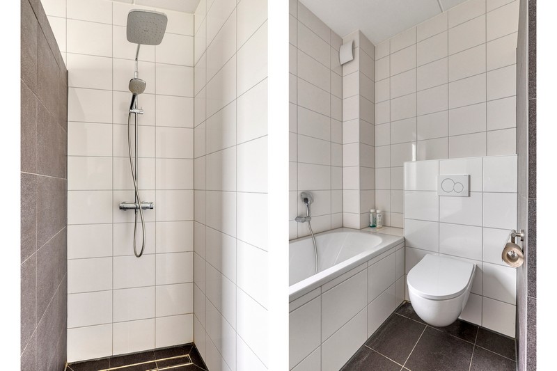 De badkamer is modern en voorzien van een ligbad, douche, een brede wastafel met twee kranen en een handig 2e toilet. Een heerlijke badkamer dus waar je lekker tot rust kan komen.