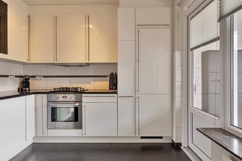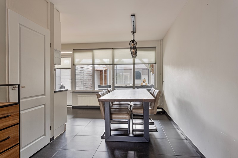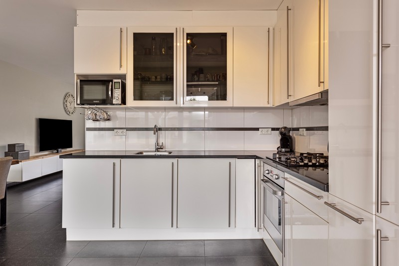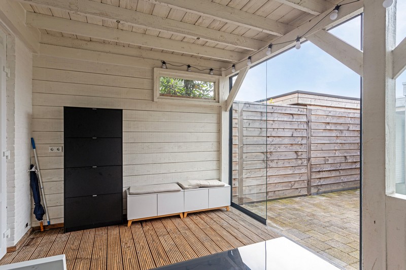 Aan de achterkant geniet je dagelijks in de fantastische moderne keuken, van alle inbouwapparatuur voorzien zoals een gaskookplaat, afzuiging, koelkast, vriezer en combi-oven en vaatwasser. Het leuke aan het eetgedeelte is dat de eettafel onderdeel is van de keuken en er dan ook écht bij hoort! Zo is koken iedere dag een feestje! En een feestje kun je ook prima houden in de met glazen wanden afsluitbare overkapping direct achter de woning.