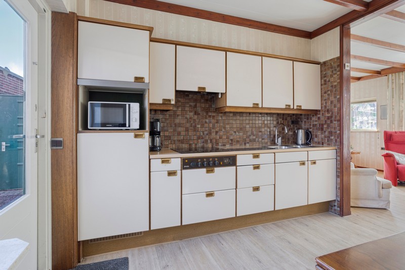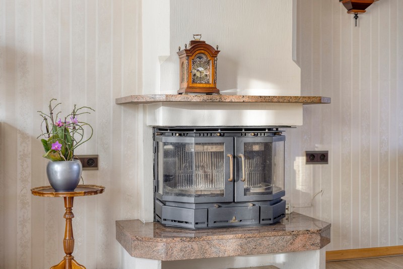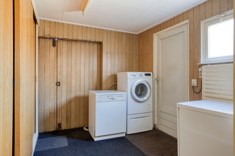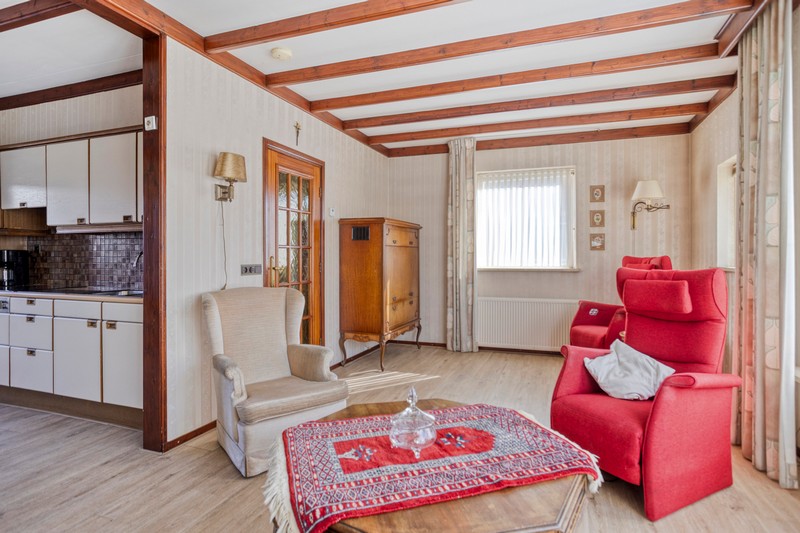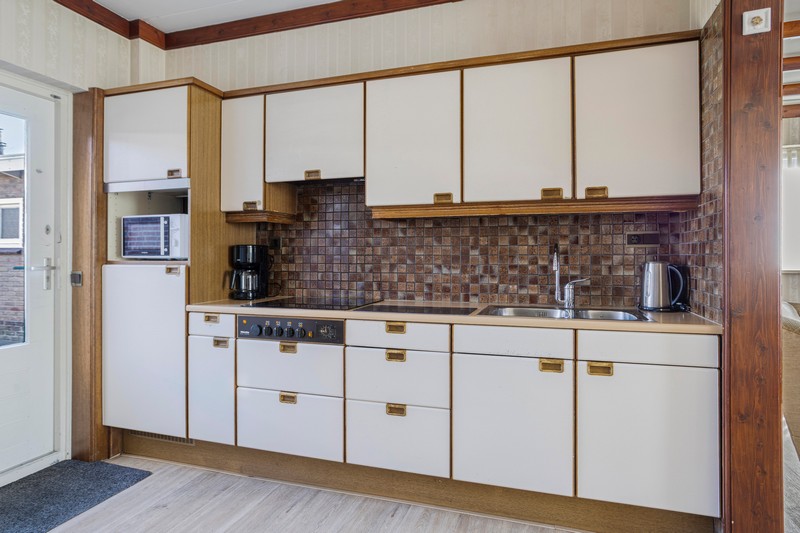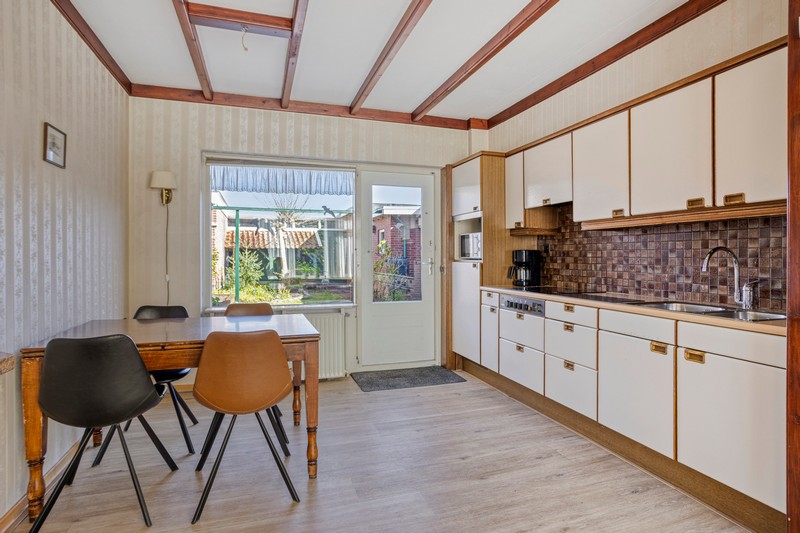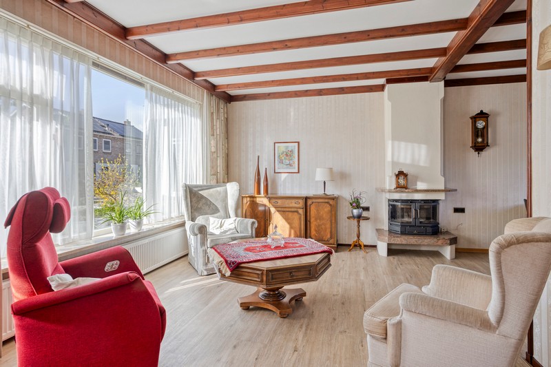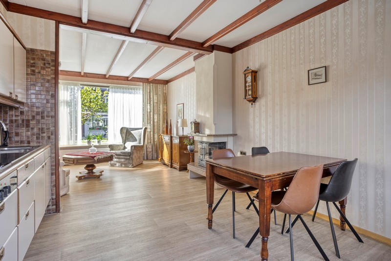 Je komt binnen in de hal met de trap naar de eerste verdieping. In de hal vinden we ook het toilet en de provisiekelder. Aan de linkerzijde vinden we de straatgerichte woonkamer over de volle breedte van de woning. De houtkachel zorgt voor warmte en sfeer en met ramen aan de voorzijde en zijkant van de woning en aan de achterzijde in de keuken, is de woning heerlijk licht. De keuken is voorzien van een eenvoudig keukenblok met de inbouwapparatuur.