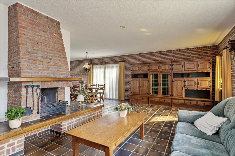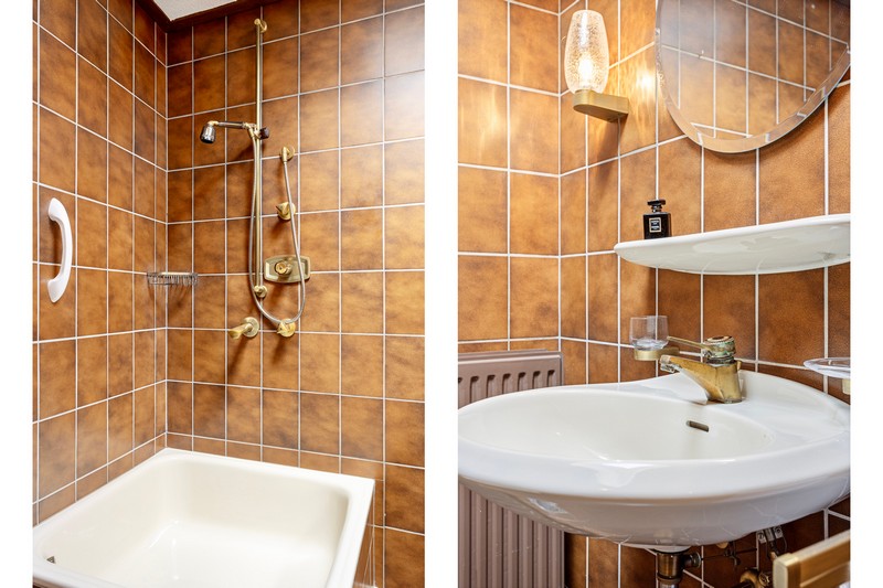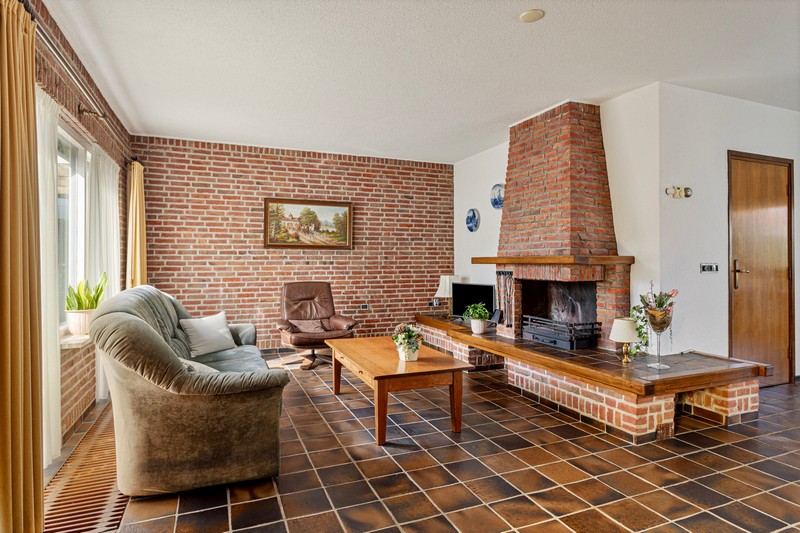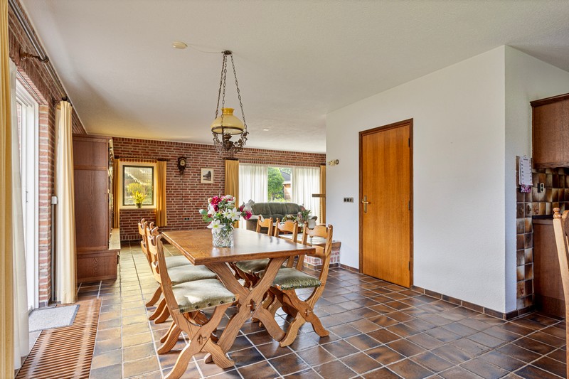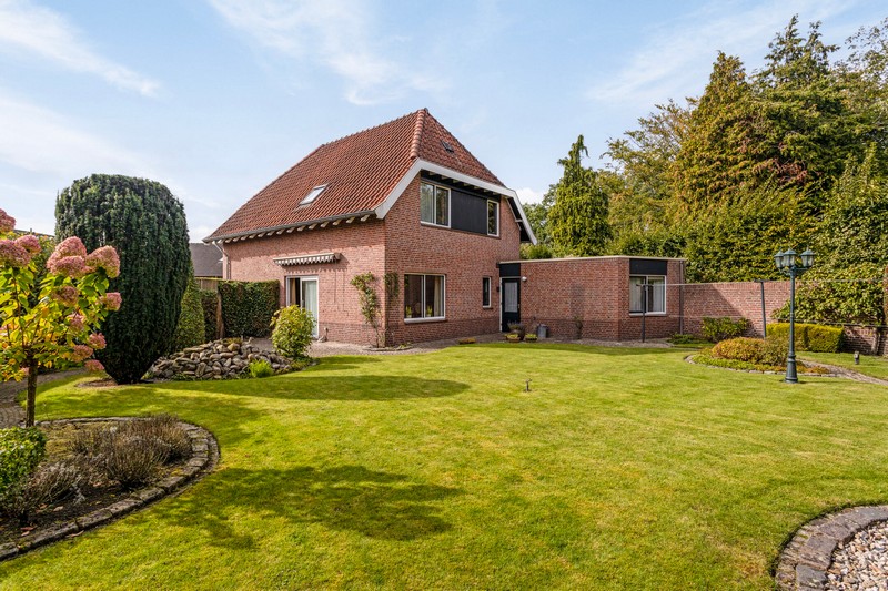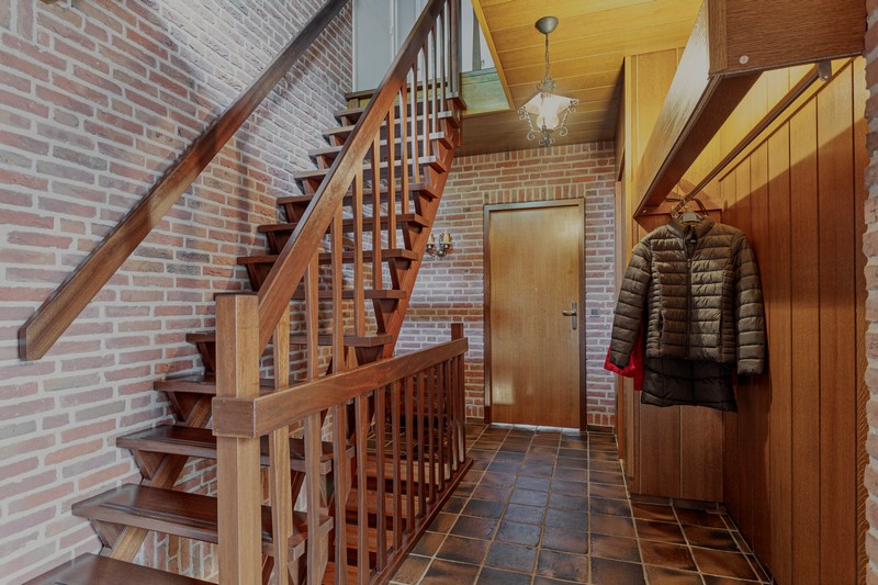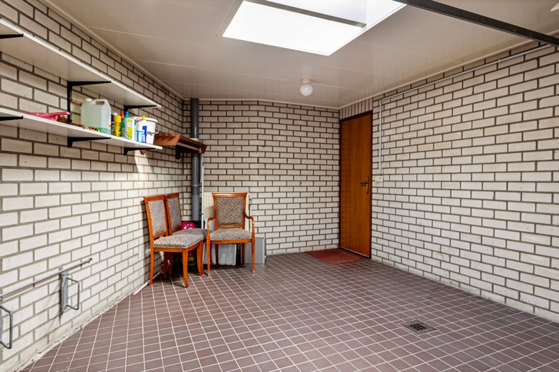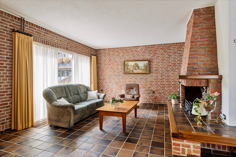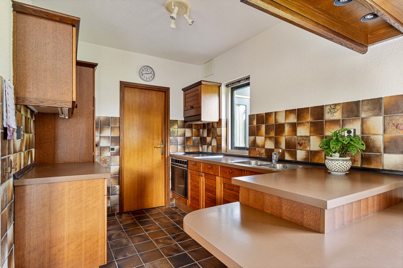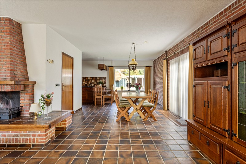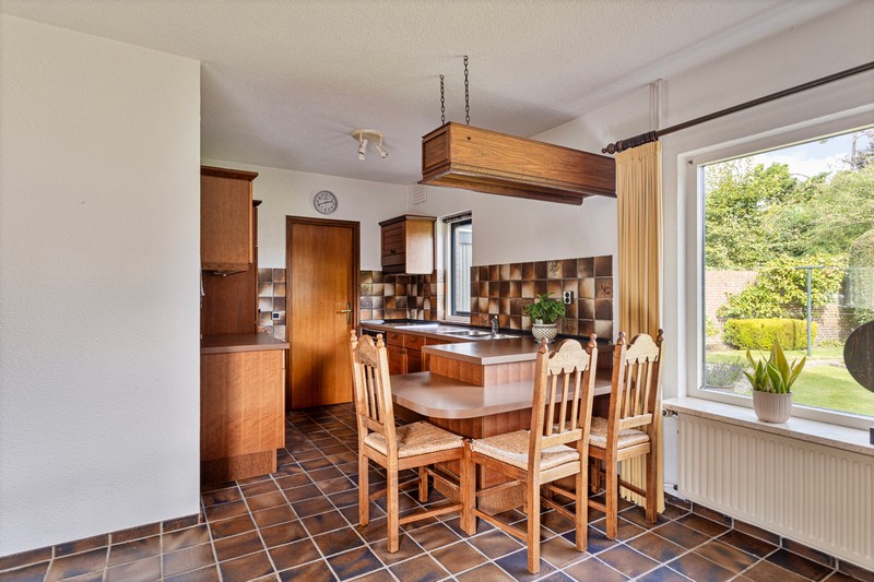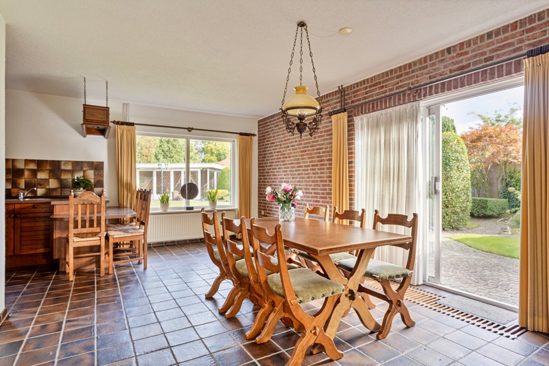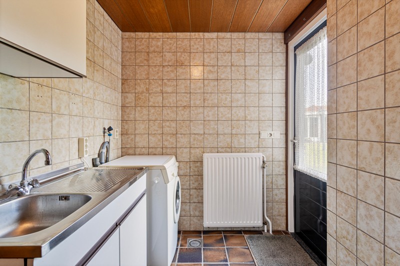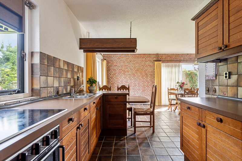 De centraal gelegen hal ontsluit vrijwel alle vertrekken op de begane grond. Laten we allereerst een kijkje nemen in de onder de hal gelegen provisiekelder. Wat een gemak! In de hal vinden we uiteraard ook de gastentoilet, meterkast en de toegang naar de aangebouwde stenen garage. De ruime L-vormige woonkamer kijkt uit over de straat en de siertuin achter de woning. De open haard zorgt voor de nodige sfeer en warmte evenals de vloerverwarming. Via de schuifpui loop je zo de tuin in. De half open keuken vinden we aan de achterzijde met direct daarnaast de handige bijkeuken/achterentree.