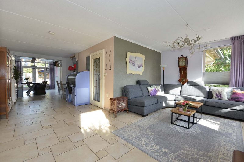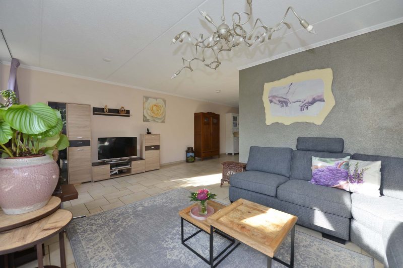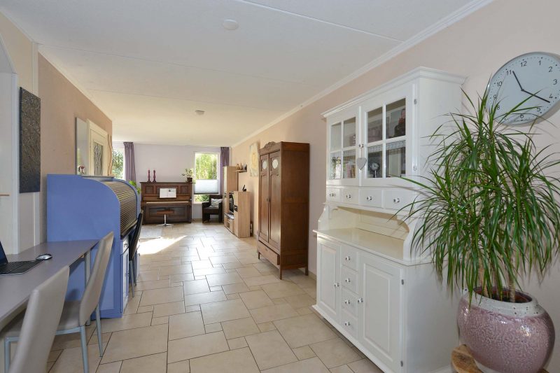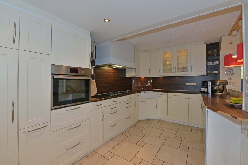 De lichte en moderne inbouwkeuken met donker aanrechtblad is voorzien van een 5-pits gaskookplaat, afzuiging, handige apothekerskast, koelkast, oven, vaatwasser en close-in boiler van 15 liter. De bijkeuken is in het verlengde van de keuken gelegen en biedt tegelijkertijd toegang tot de ruime garage. In de bijkeuken vinden we de aansluiting voor de wasmachine, een handige gootsteen en de pomp van de vloerverwarming.