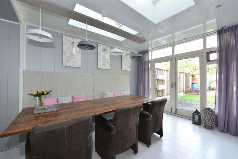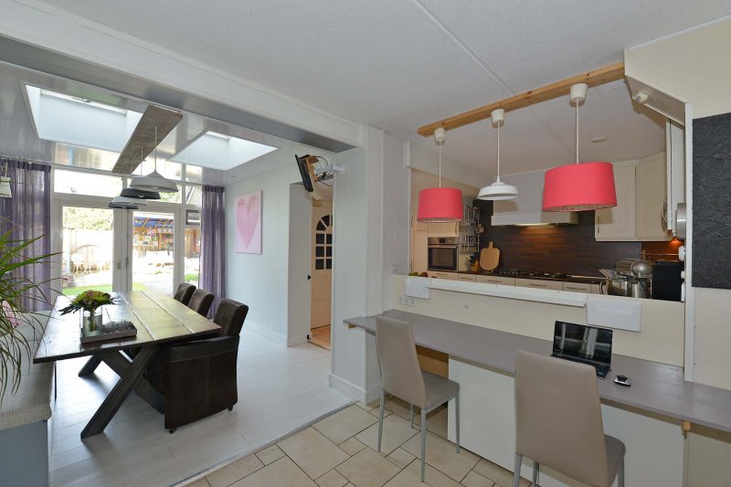 Laten we de rondgang door de woning maar gewoon in de hal beginnen met meterkast en toiletruimte. Onder de trap zit een provisiekelder. De ruime L-vormige woonkamer vinden we aan de straatzijde. Hoge ramen aan de voor- en zijkant van de woning zorgen voor een overvloed aan licht. En dat geldt ook voor de achterzijde. De uitbouw is voorzien van een grote lichtstraat, ramen tot op de grond en dubbele tuindeuren. Vloerverwarming in de woonkamer, keuken en serre zorgt voor een aangenaam woonklimaat.