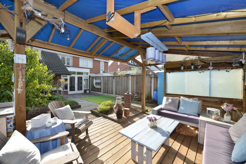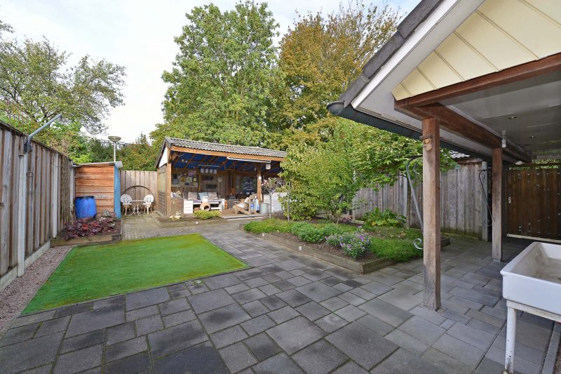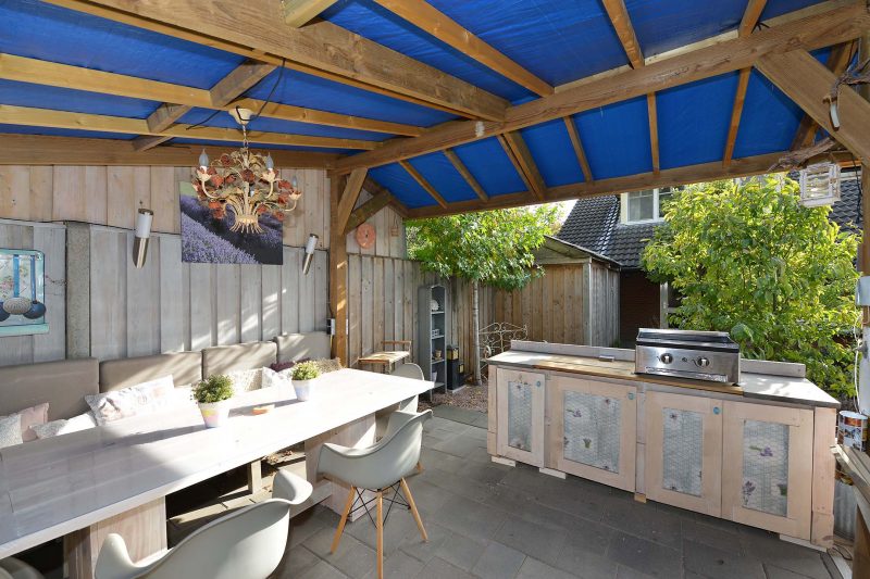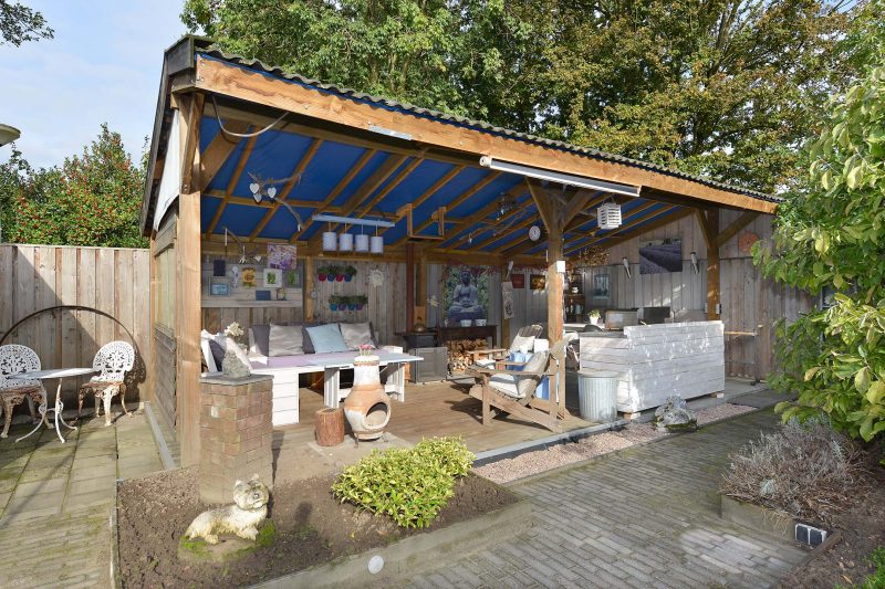 Wat vooral opvalt in de omsloten achtertuin is de vrijheid. Met veel groen rondom de woning heb je geen last van pottenkijkers. De tuin is vanuit de woning maar ook via een achterom bereikbaar. De reusachtige overkapping achter in de tuin biedt plaats aan een loungeset, een enorme eettafel, een buitenkeuken, fraaie potkachel en wat al niet meer. Heerlijk genieten dus van lange zomeravonden.