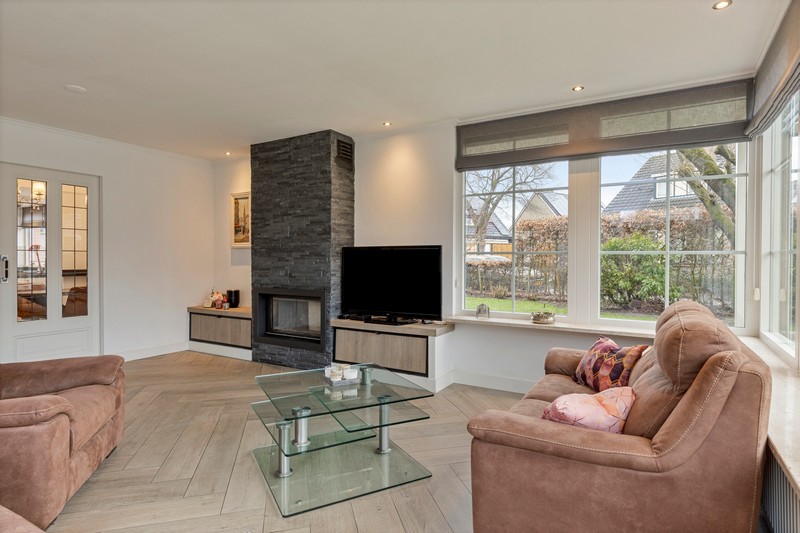 Via de suitedeuren komen we in de gezellige woonkamer met tuindeuren naar het terras en open haard. Het vele glas in de erker zorgt voor een lekker lichte ruimte met uitzicht op de fraaie tuin. Woonkamer, keuken, hal en toilet hebben een fraaie keramische parketvloer met vloerverwarming voor het nodige comfort.