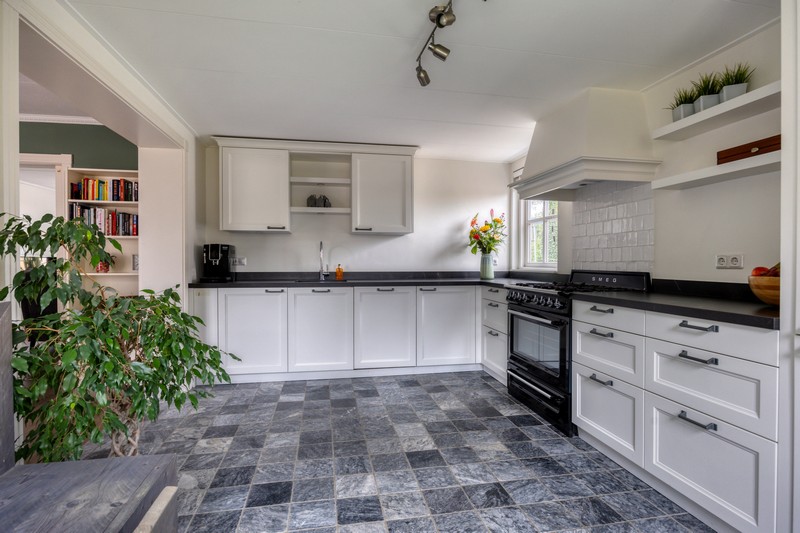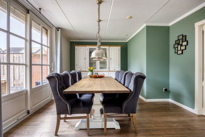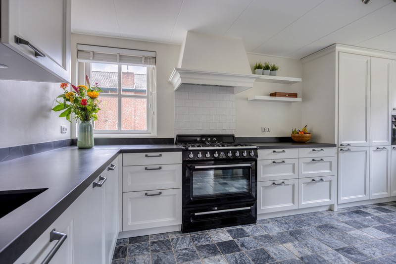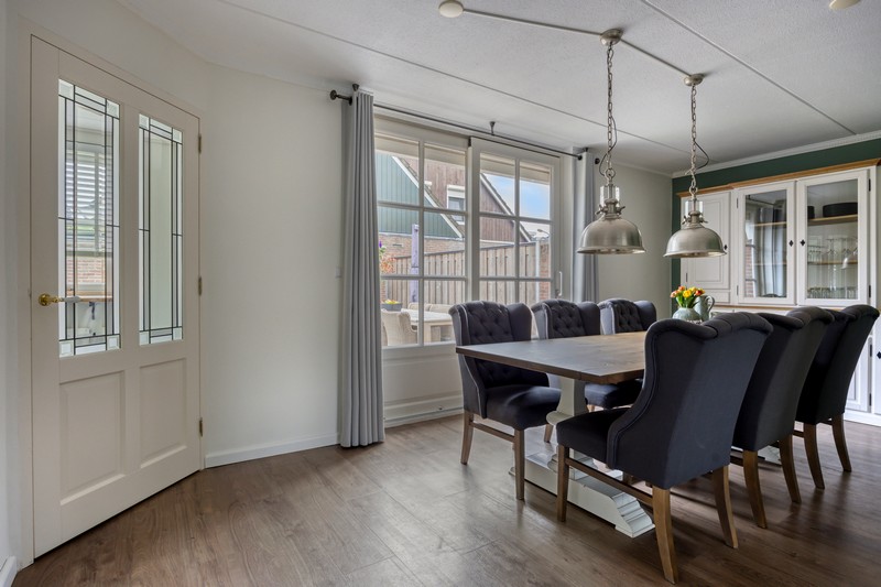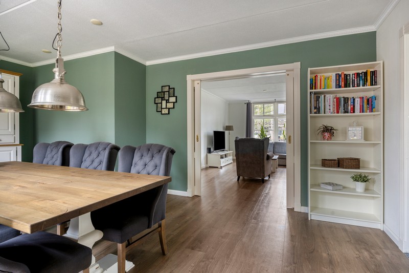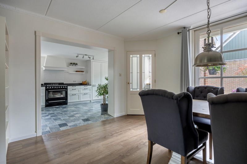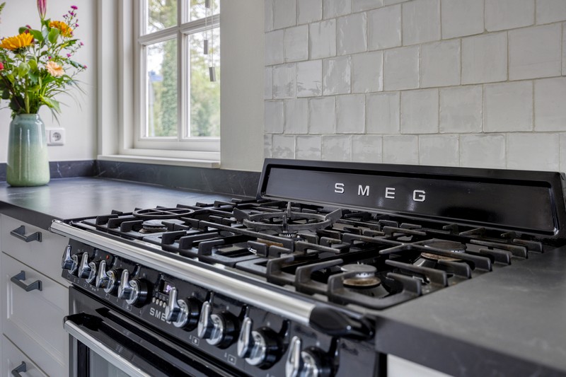 Als u de woonkamer binnenkomt, valt de immense ruimte op! De zitkamer aan de voorzijde is middels suitedeuren afgescheiden van de tuingerichte eetkamer. Middels een grote doorgang komen we in de eveneens ruime keuken die voorzien is van een lichte inbouwkeuken met donker blad. Pronkstuk is het SMEG fornuis met 5-pits gaskookplaat en oven. Verder is er een afzuiging, koel-vriescombinatie, SMEG combimagnetron en vaatwasser aanwezig.