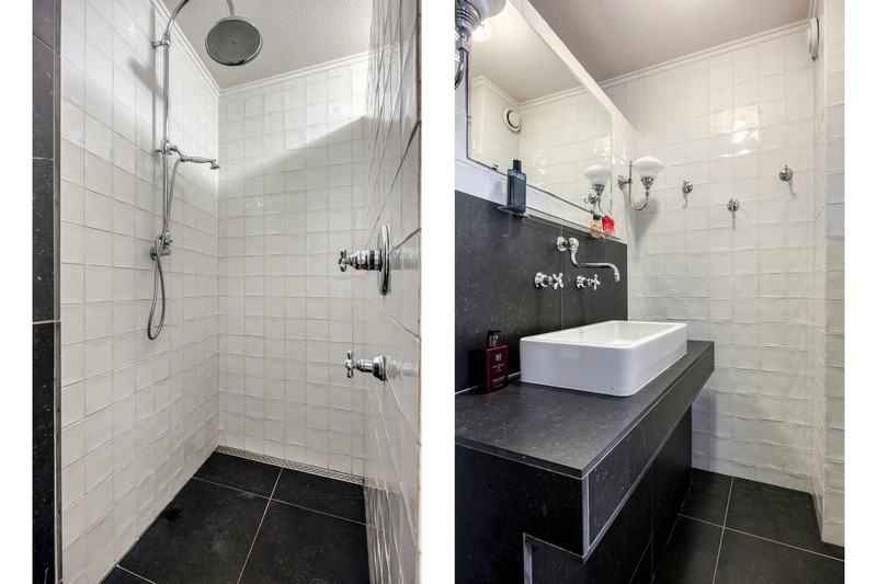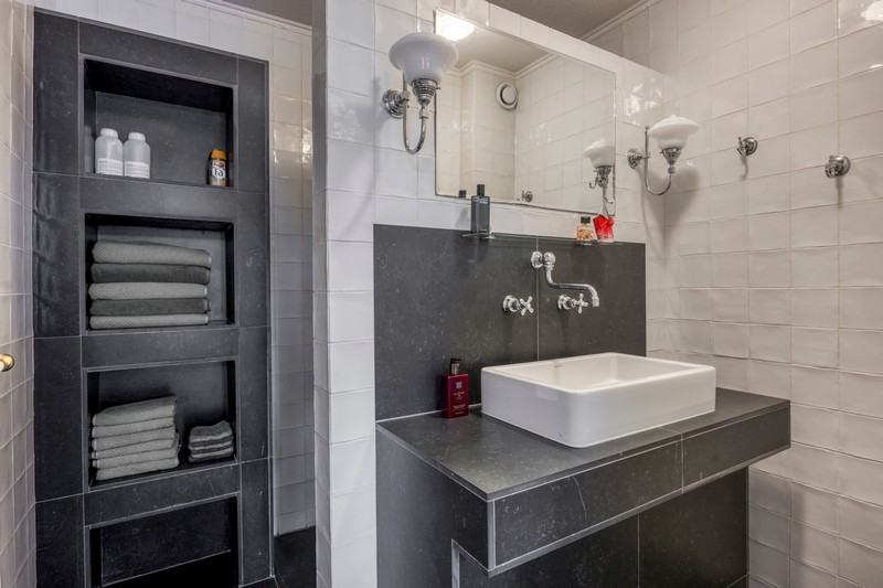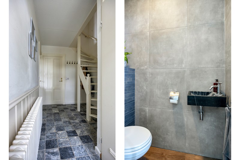 We komen binnen via de hal aan de voorzijde. In de hal vinden we de meterkast, toilet, trapopgang naar de 1e verdieping en een moderne badkamer in antraciet/wit met een brede keramische wastafel en grote inloopdouche met regendouche.