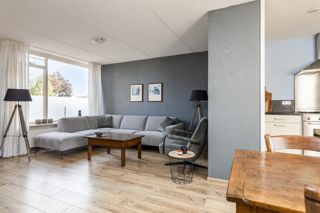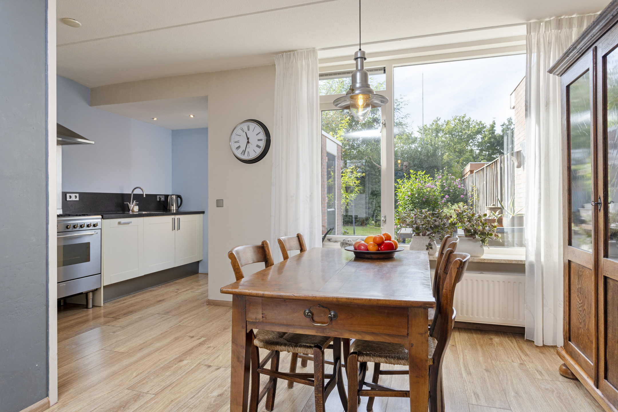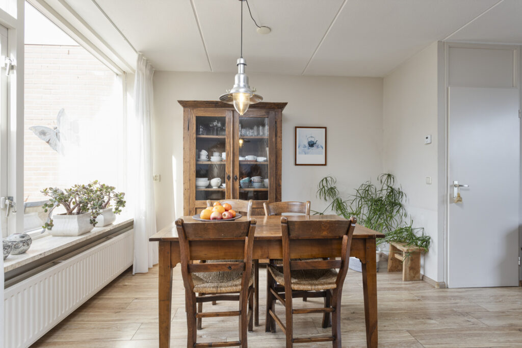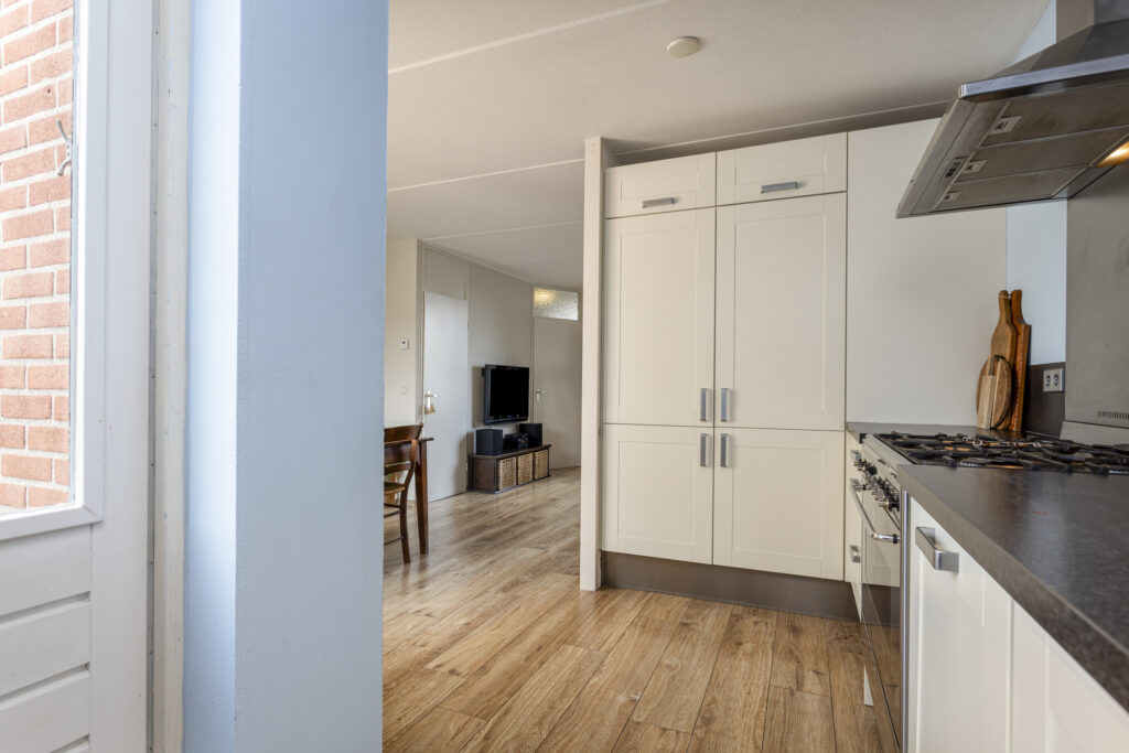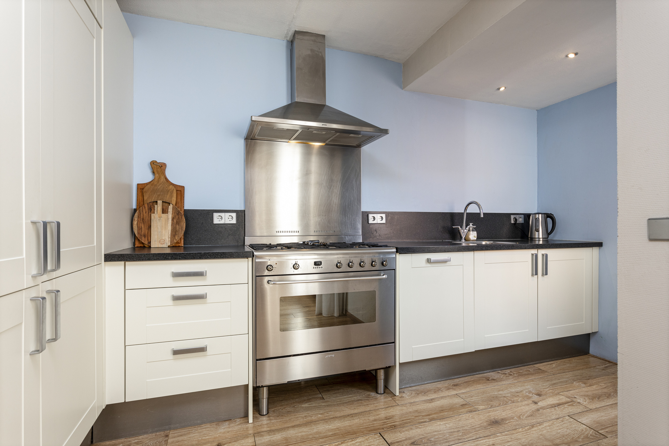 De open keuken met lichtkleurige L-vormige inbouwkeuken is voorzien van een koelkast, vaatwasser, 5-pits RVS fornuis met oven en afzuigkap eveneens in RVS uitvoering. Ook is er een vaste trapkast in de woonkamer waarin je heel wat spullen kunt opbergen.