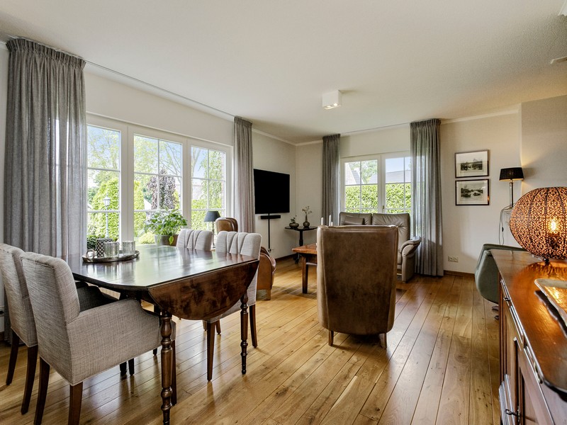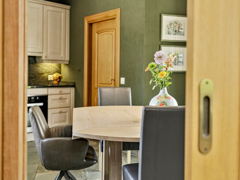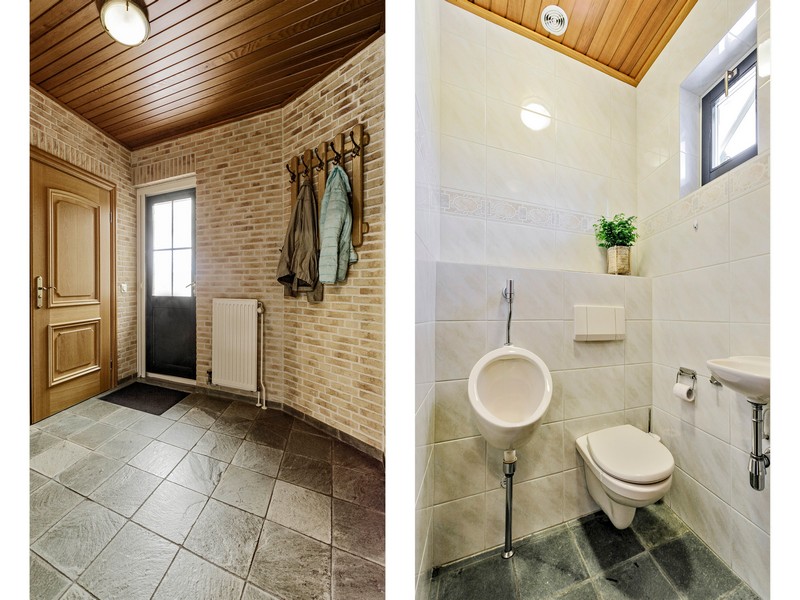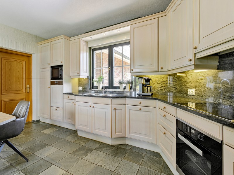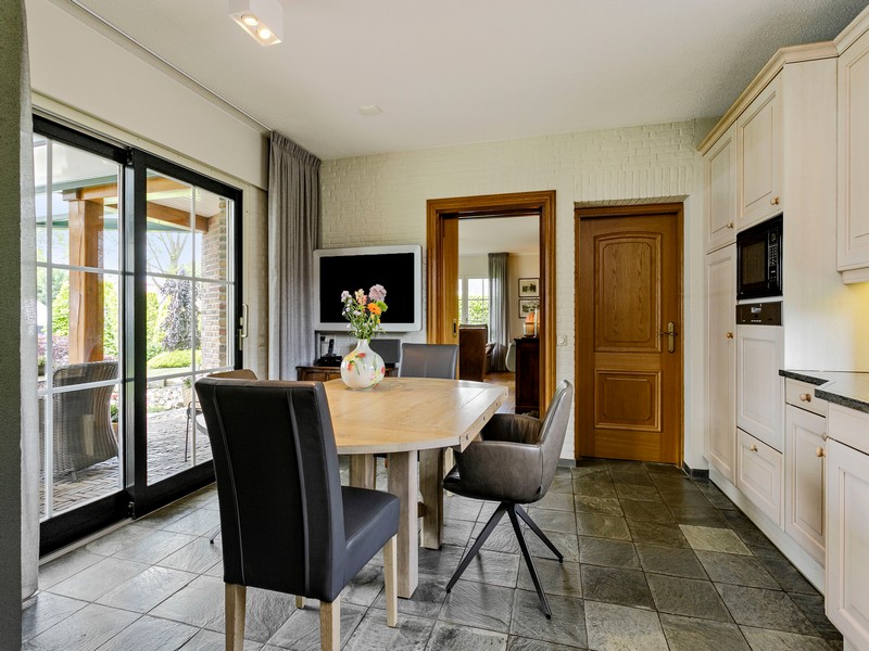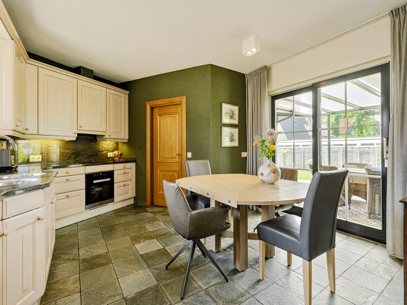 De woonkeuken vormt de verbinding tussen hoofd en bijgebouw en is voorzien van inbouwkeuken met allerhande apparatuur. Aan de achterzijde vinden we een grote schuifpui die toegang biedt tot het achter de woning gelegen overdekte terras. Via de achterentree/bijkeuken met kelderkast komen we in de ruime dubbele en geïsoleerde garage die is uitgerust met sectionaal deuren.
