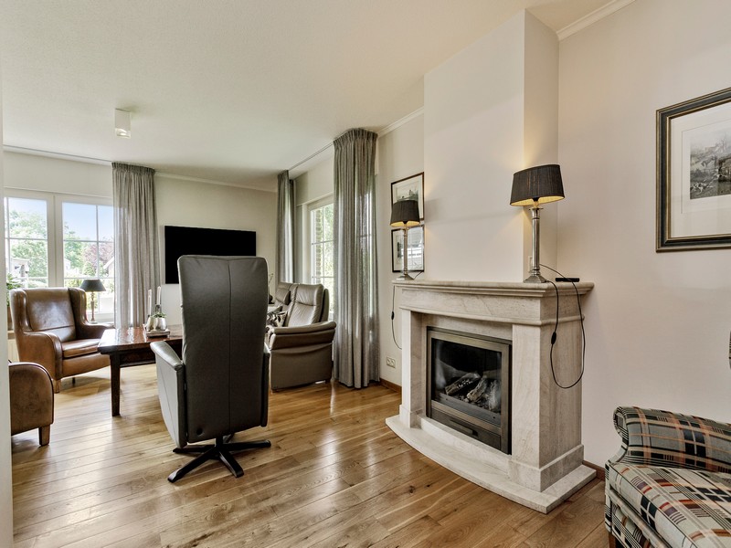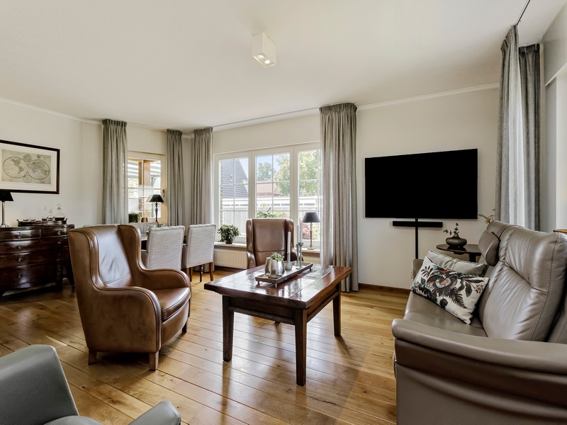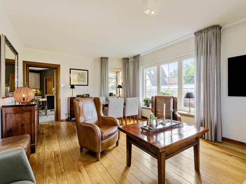 De L-vormige met zonovergoten woonkamer is gelegen aan de zuidwestzijde van de woning en is voorzien van gaskachel en massief houten vloer. De woonkamer kijkt over de achter en zijkant van de rondom de woning gelegen tuin.