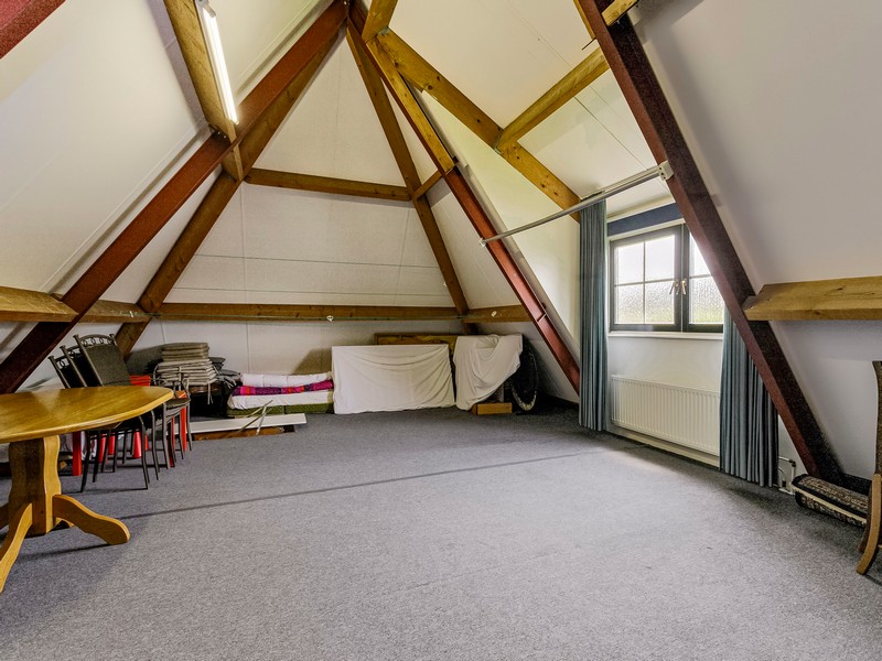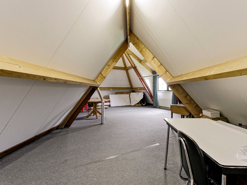 Boven de aanbouw vinden we een hele ruime, eveneens vanaf de overloop toegankelijke, zolderkamer. Met een vloeroppervlak van ruim 60 m² zijn er eenvoudig meerdere ruimtes te realiseren waarbij te denken valt aan een chillruimte, sportzaaltje, thuisbioscoop of meerdere extra slaapkamers.