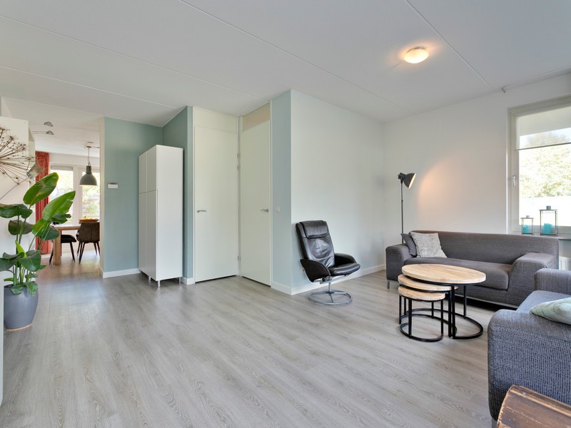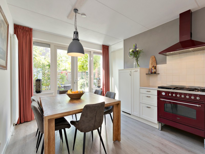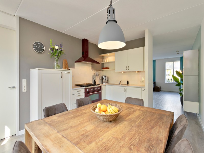 Op de begane grond vinden we bijvoorbeeld een royale L-vormige woonkamer met vrij uitzicht het buitengebied in. Aan de achterzijde ligt een royale woonkeuken met openslaande deuren naar de achtertuin. De keuken is ingericht met een inbouwkeuken in hoekopstelling en is onder andere voorzien van een Boretti fornuis. Tussen garage en keuken is de ruime bijkeuken gelegen met meer dan voldoende ruimte voor de wasmachine, handig keukenblok met spoelbak en kastruimte voor proviand.