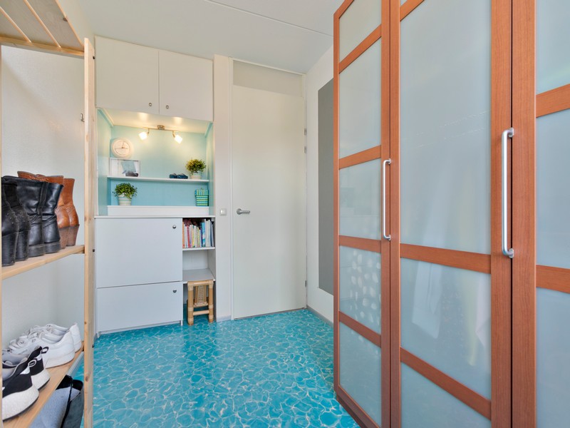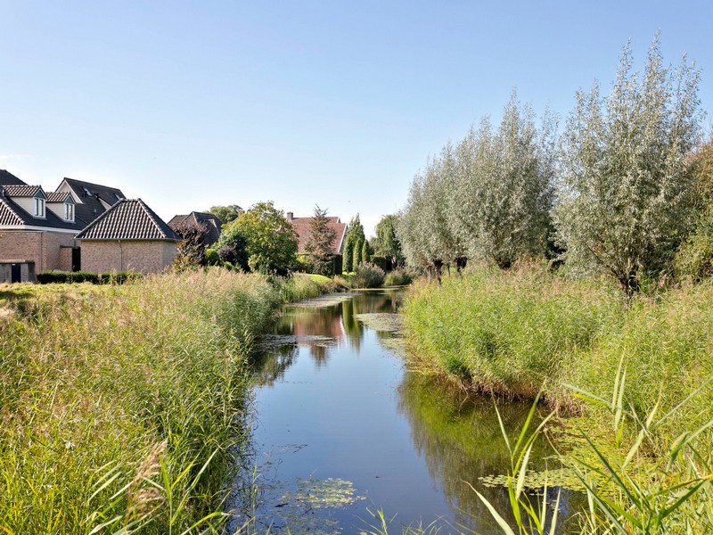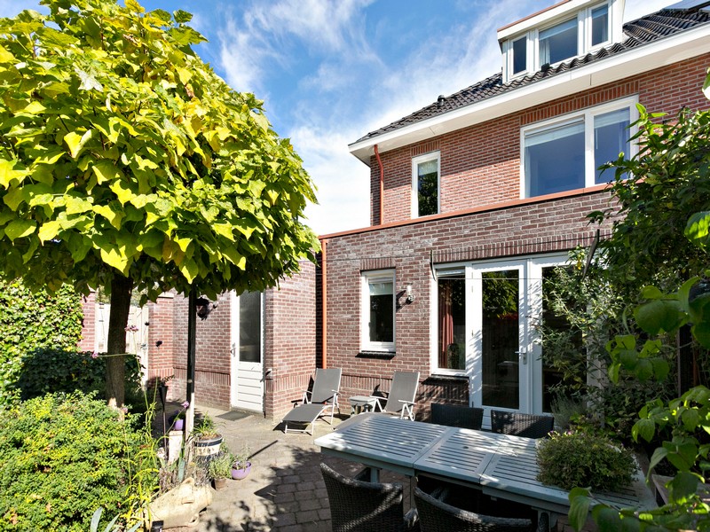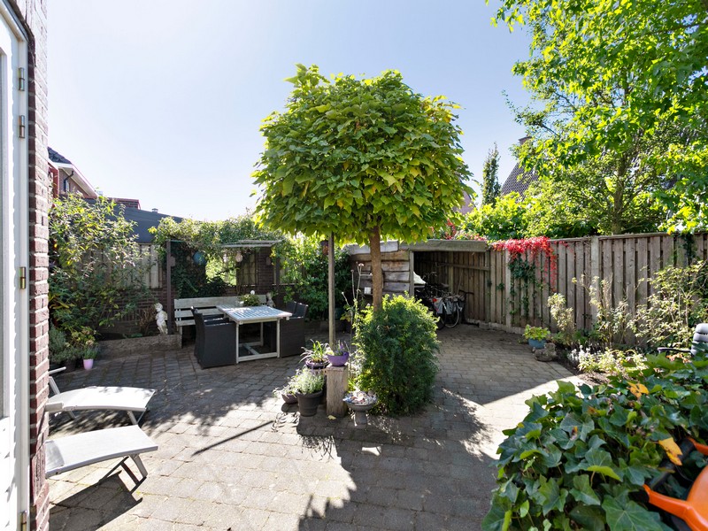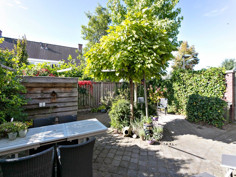 De achtertuin is bijzonder fraai op de zon gelegen. De omsloten tuin is onderhoudsarm aangelegd. De tuinmuur is voorzien van een poort zodat de tuin ook achterom is te bereiken. Aan de rechterzijde treft u geen buren maar een brede groenstrook met waterpartij waardoor je kunt genieten van de vrije ligging.