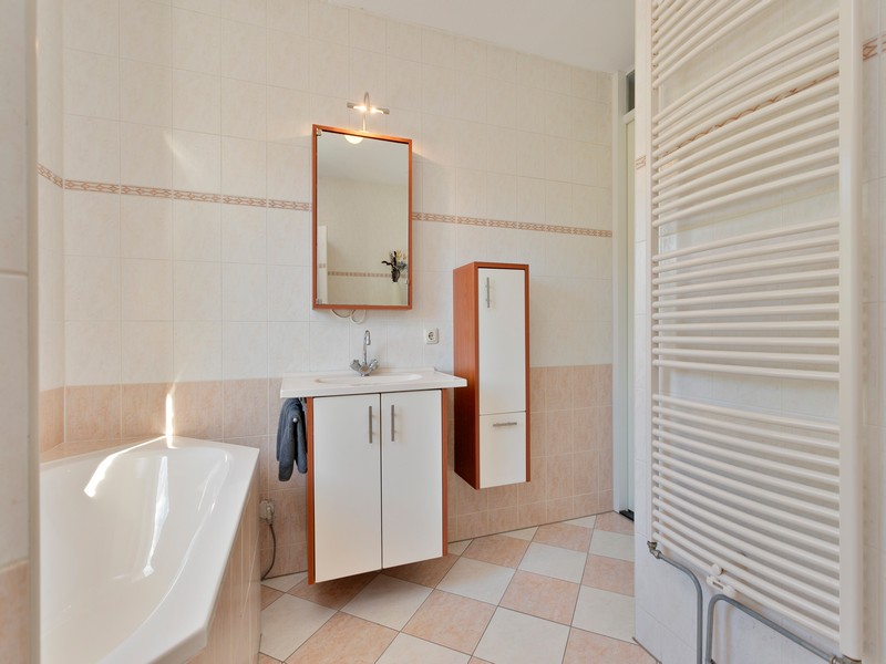 Op de 1e verdieping vinden we 3 ruime slaapkamers. De badkamer bestaat uit een royale inloopdouche, ligbad, zwevend toilet en wastafelmeubel. Op zolder bevindt zich een ruime 4e slaapkamer, eventueel voldoende ruimte voor een 5e slaapkamer en uiteraard de nodige bergruimte.