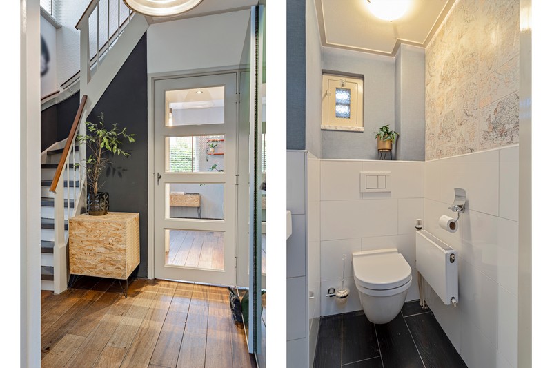 Op de begane grond vinden we de entree met meterkast, handige schoenenkast en toilet, De L-vormige-woonkamer bestaat uit een achter- en voorkamer gescheiden door suitedeuren. De sfeervolle voorkamer strekt zich uit over de volledige breedte van de woning en heeft een gezellige houtkachel, De massief houten vloer vinden we niet alleen in de beide kamers maar ook in de achter de woning gelegen woonkeuken.