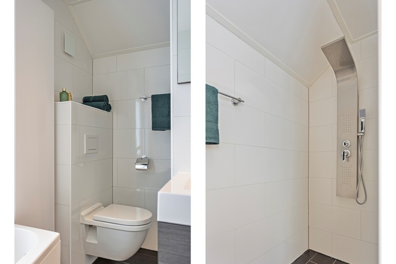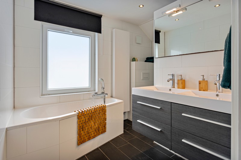 Op de eerste verdieping vinden we drie ruime slaapkamers waarvan één voorzien van balkon en een compleet ingerichte moderne wit-antraciet kleurige badkamer met ligbad, inloop-regendouche, dubbele wastafel in een handig meubel en zwevend toilet.