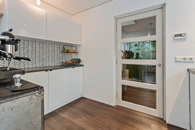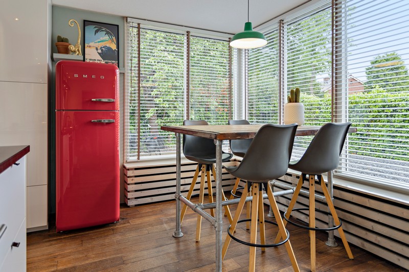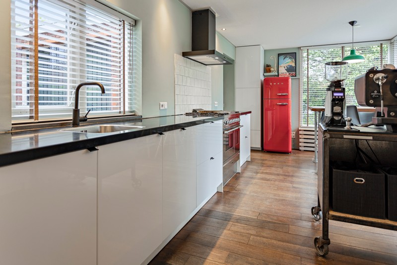 De woonkeuken is voorzien van een lichte inbouwkeuken met antraciet-grijs natuurstenen werkblad. Het grote RVS-fornuis heeft een grote en kleine oven, 4 gaspitten en een bakplaat. De keuken is verder voorzien van een afzuiging, vaatwasser en SMEG koelkast.