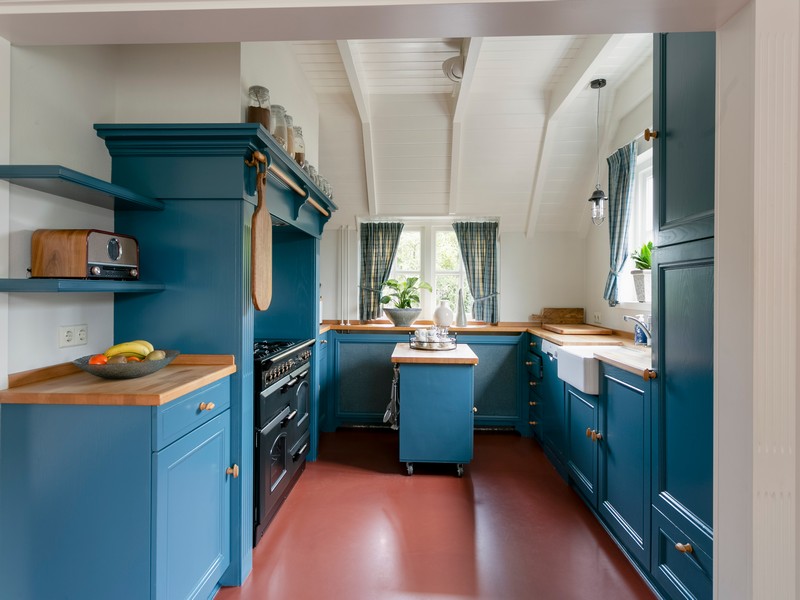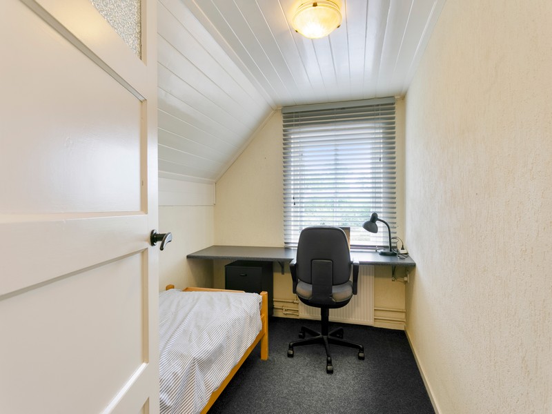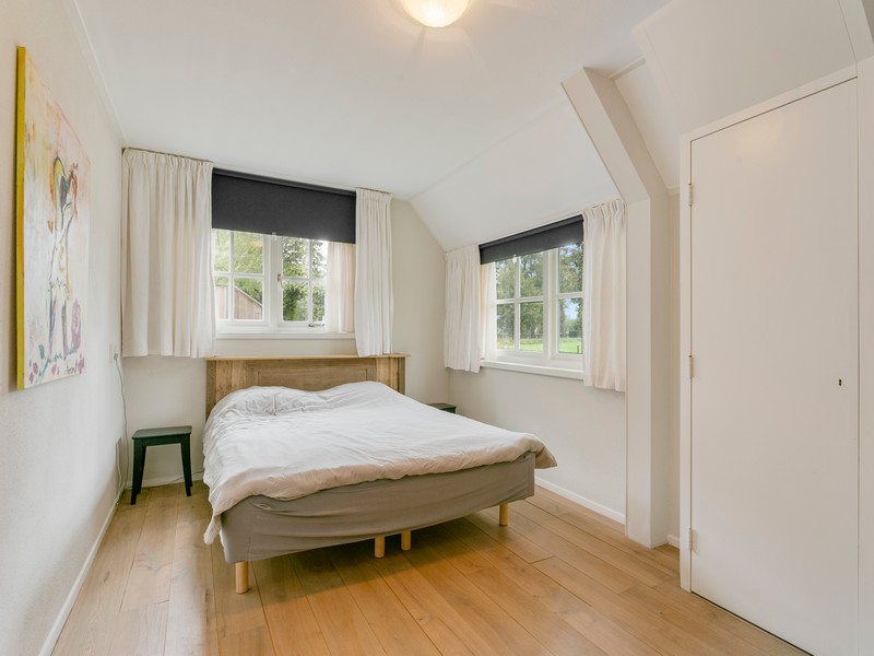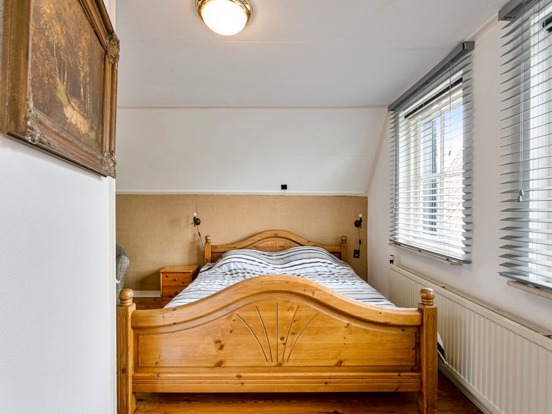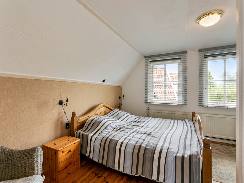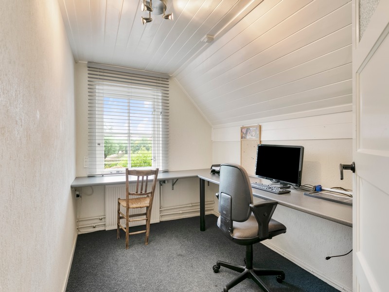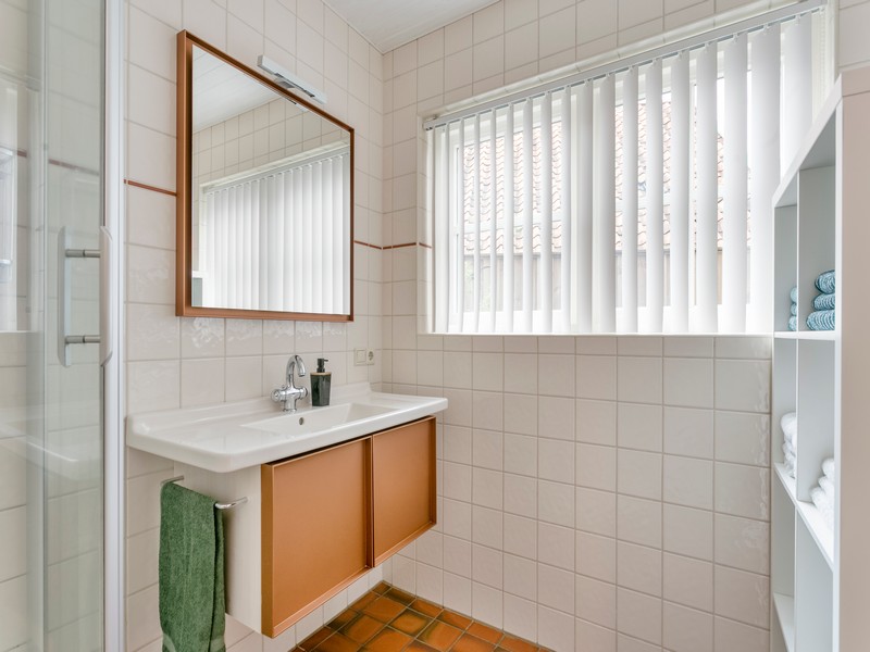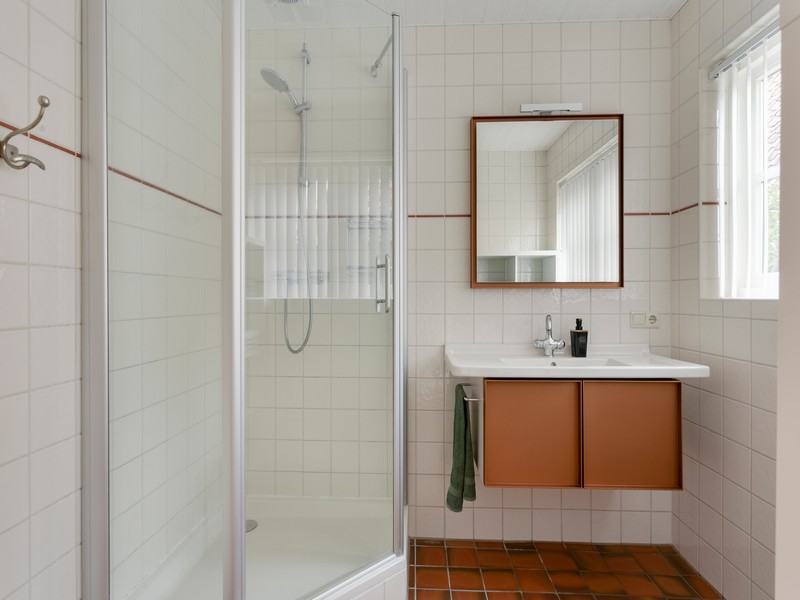 Op de begane grond vinden we verder een ruime slaapkamer en een badkamer met douche en wastafel. Via een gang met veel kastruimte komen we in de bijkeuken/achter entree van de woning.