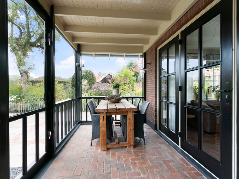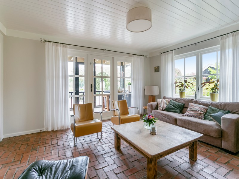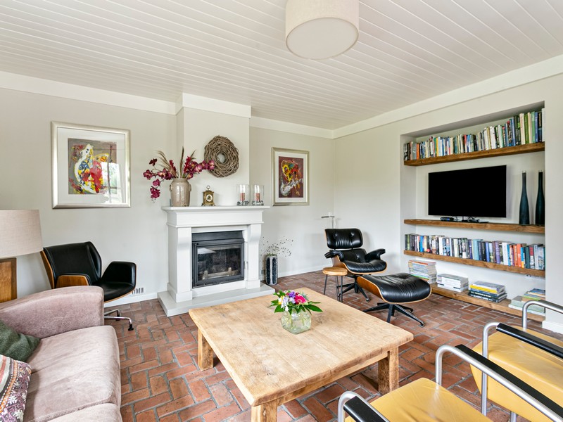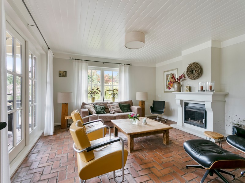Via de hal met trapopgang komen we in een riante woonkeuken met inbouwkeuken. Wat direct opvalt is het weidse uitzicht over je eigen domein. En dat geldt eigenlijk voor alle leefruimtes die in de woning aanwezig zijn. Afwerking en uitstraling van de woning zijn uitstekend in balans wat ook in de woonkamer tot uiting komt. Volop sfeer met een vloer van gebakken klinkers en een open haard die tijdens het branden de CV ondersteunt. Verlengstuk van de woonkamer is de serre waar het lekker vertoeven is achter het glas. Buiten en toch binnen.
