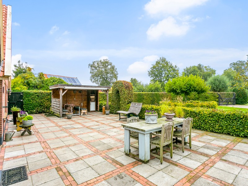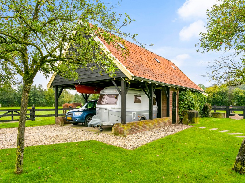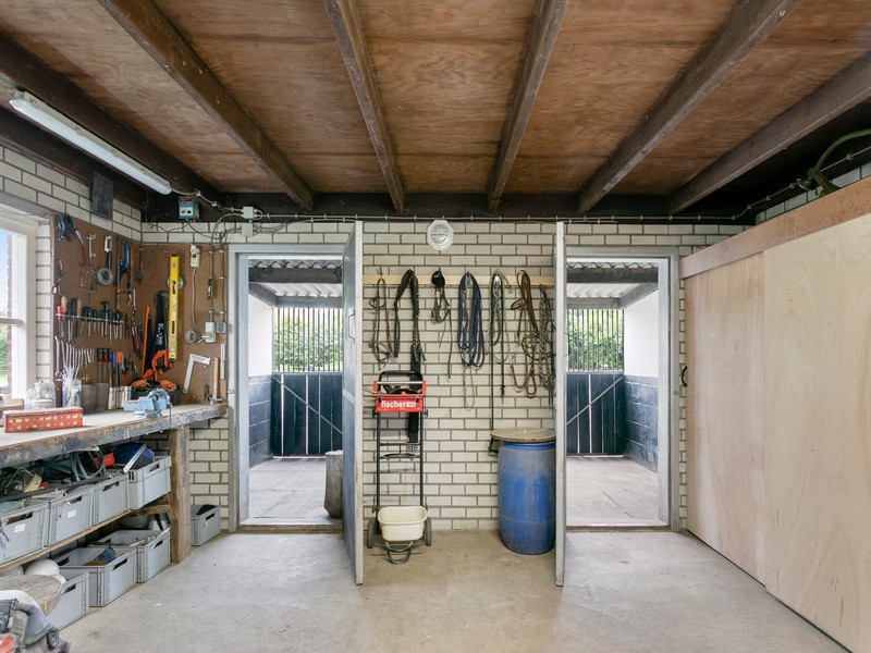 Onder andere in garage/werkplaats die gecombineerd is met de stalruimte en carport. Boven garage en carport is een grote zolderberging gelegen. Aan de rand van het perceel gelegen kapschuur bied ruimte aan al het tuin gereedschap.