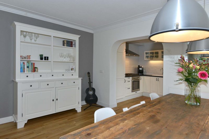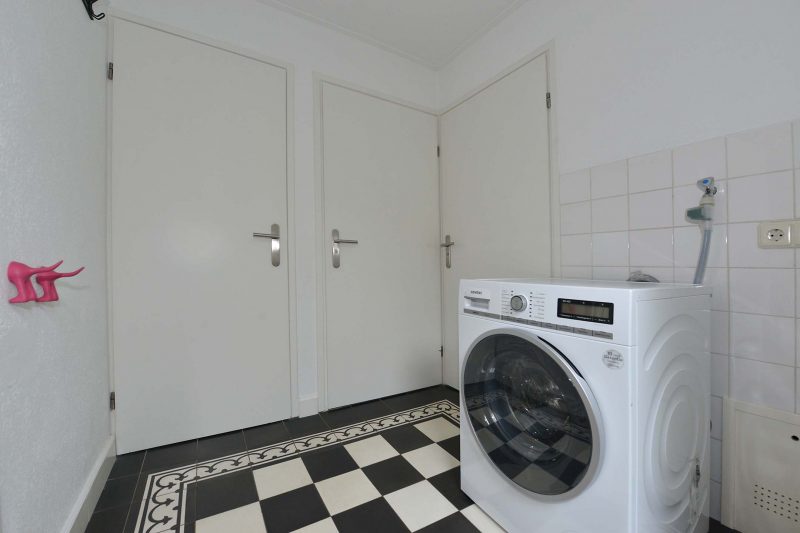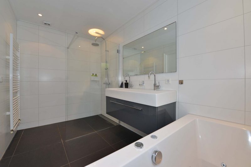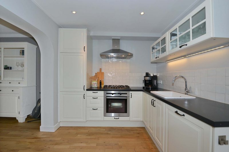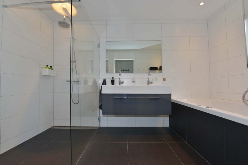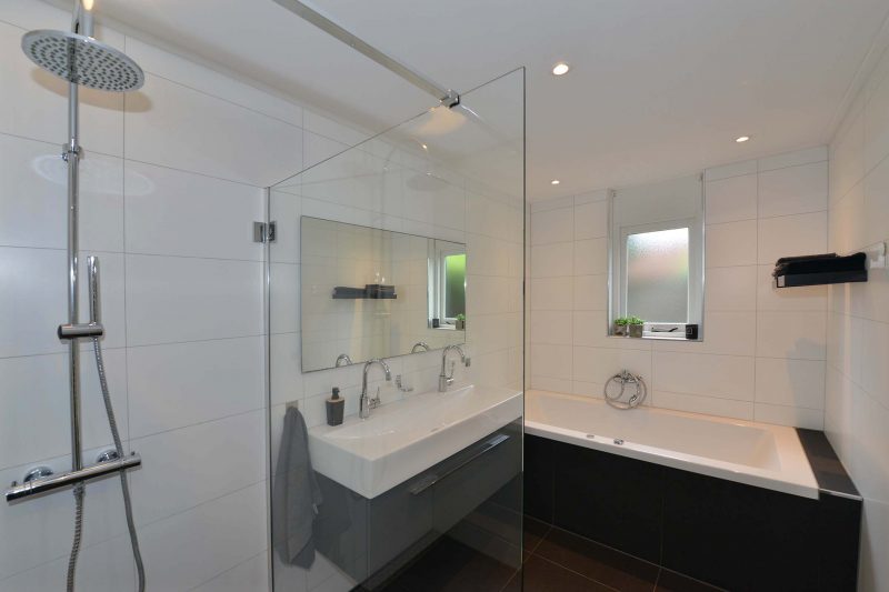 De vloer van de woonkamer loopt naadloos over naar de keuken die zich in de aanbouw achter de woning bevindt. Deze is voorzien van gaskookplaat, afzuiging, oven, koelkast, vriezer en vaatwasser. In de achterentree vinden we de stookruimte, de toiletruimte en de meterkast. De moderne en ook ruime badkamer is voorzien van een ruime inloopdouche “voor het hele gezin”, dito ligbad en een breed wastafelmeubel voorzien van 2 kranen.