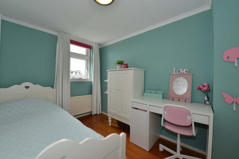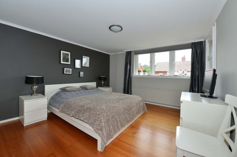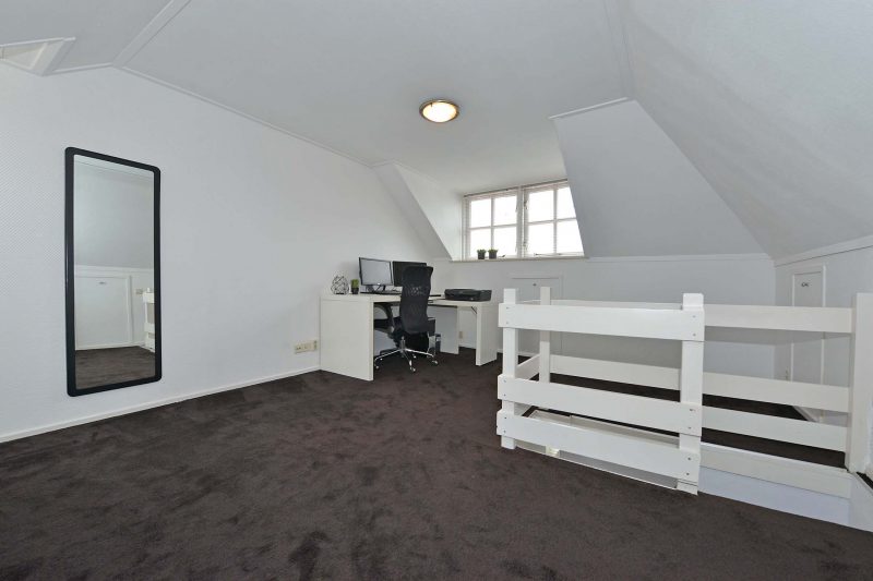 Op de 1e verdieping vinden we naast een overloop, 3 slaapkamers. De ouderslaapkamer is voorzien van 2 ruime vaste kasten. De 4e slaapkamer vinden we op zolder waar we zowel aan de voor- als de achterzijde een dakkapel vinden. De ruimte achter de knieschotten wordt benut als bergruimte.