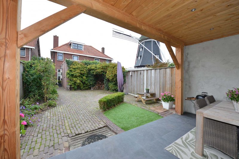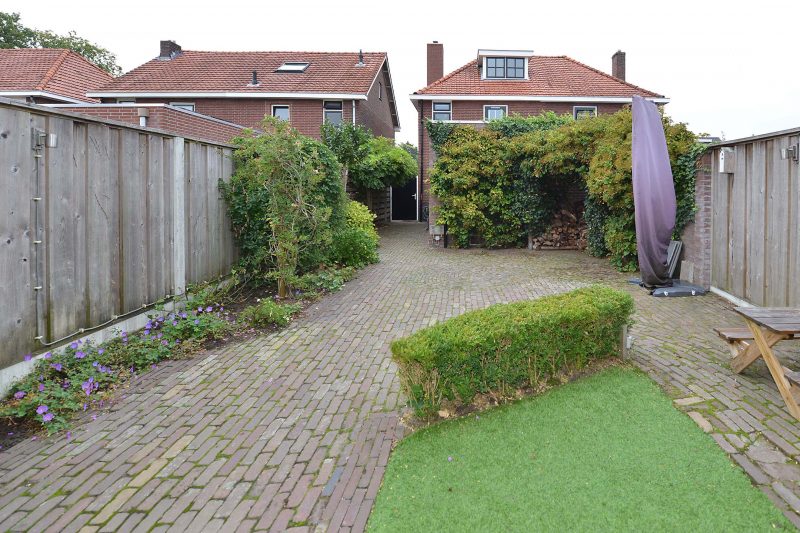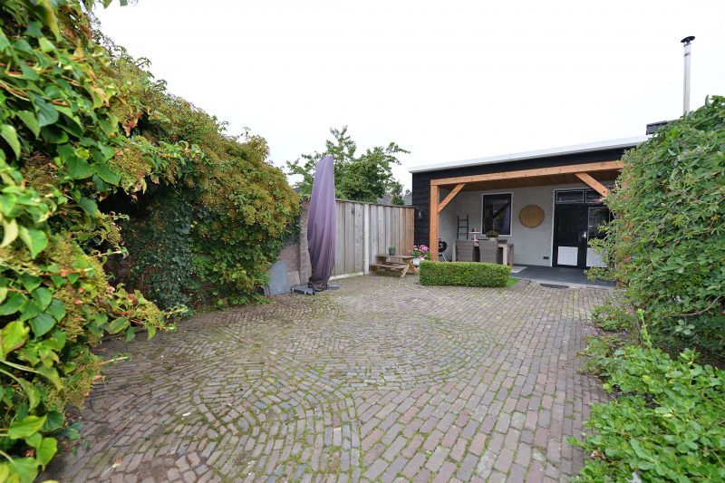 En bergruimte vinden we ook in de berging. De voormalige werkplaats/hobbyruimte is verbouwd tot berging van formaat en aan de tuinzijde vinden we een grote overkapping waar op menig warme zomerdag heerlijk in de schaduw kunt zitten. En dat is ook wel nodig. Van ‘s morgens vroeg tot ’s avonds laat is er zon te vinden in de omsloten tuin.