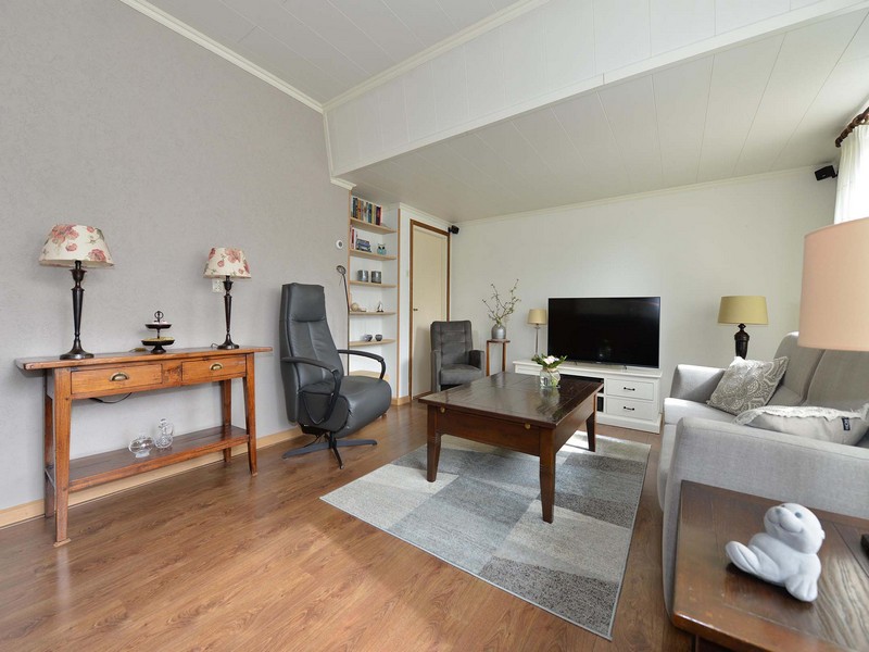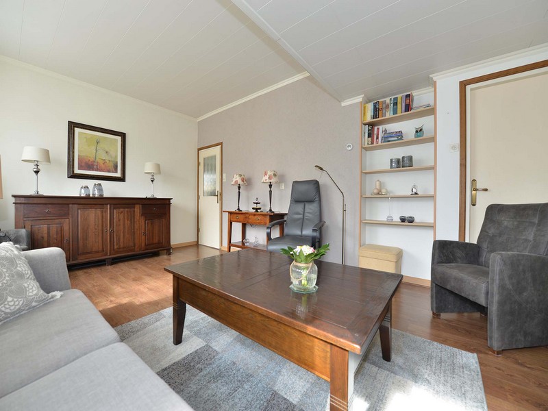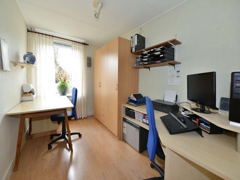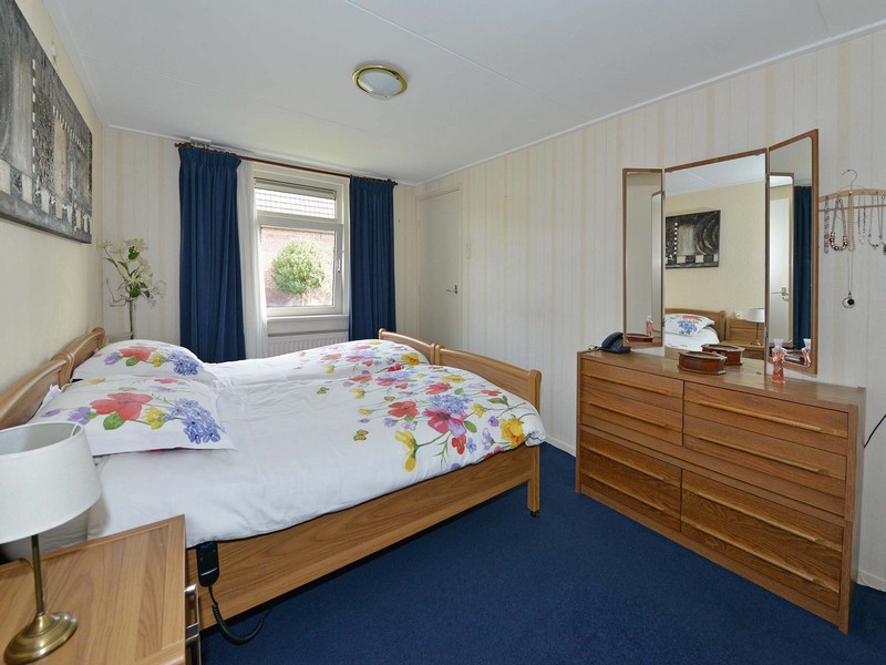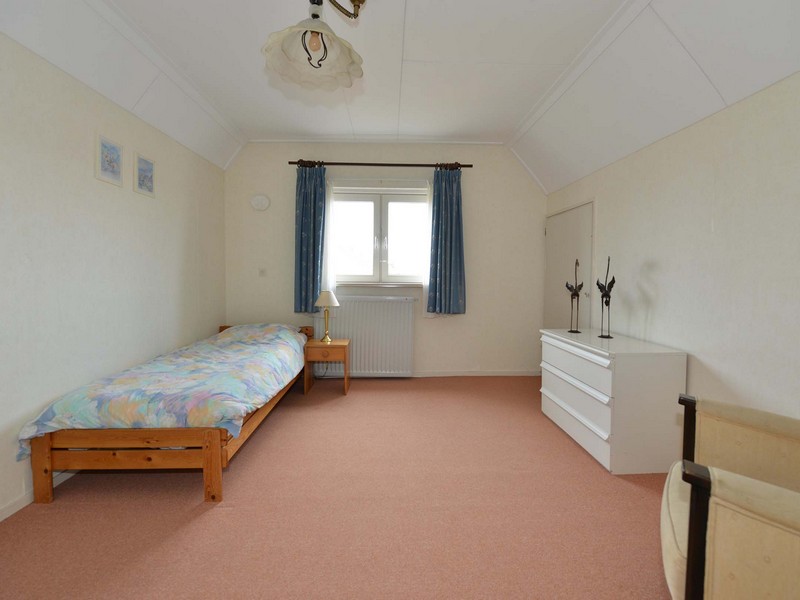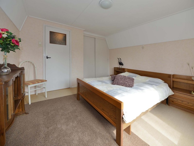 Op de begane grond vinden we ook een ruime slaapkamer met schuifkasten en een badkamer met wastafel en doucheruimte. In de aanbouw vinden we verder een bijkeuken/achterentree met daarboven een bergzolder.