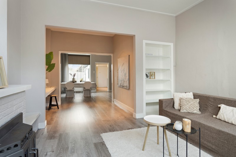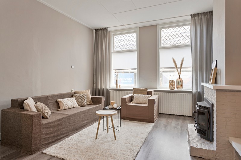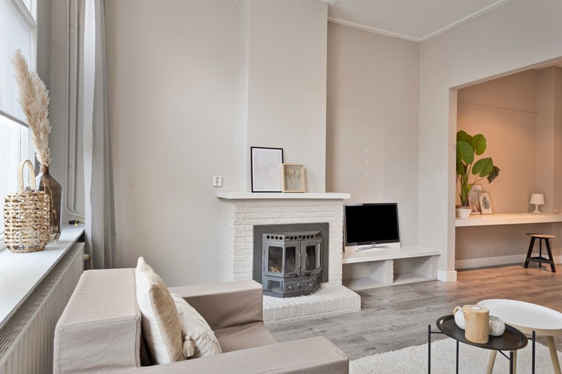En dat merk je direct als je de hal binnen stapt. Hoge plafonds in de hoofdbouw kenmerken de periode waarin de woning is gebouwd. De lange hal gaf toegang tot de voorkamer, opkamer en achterkamer van de woning. Inmiddels zijn deze ruimtes bij elkaar aangetrokken waardoor een ruime L-vormige woonkamer is ontstaan van maar liefst 43 m². In de voormalige voorkamer vinden we een rookkanaal met houtkachel.